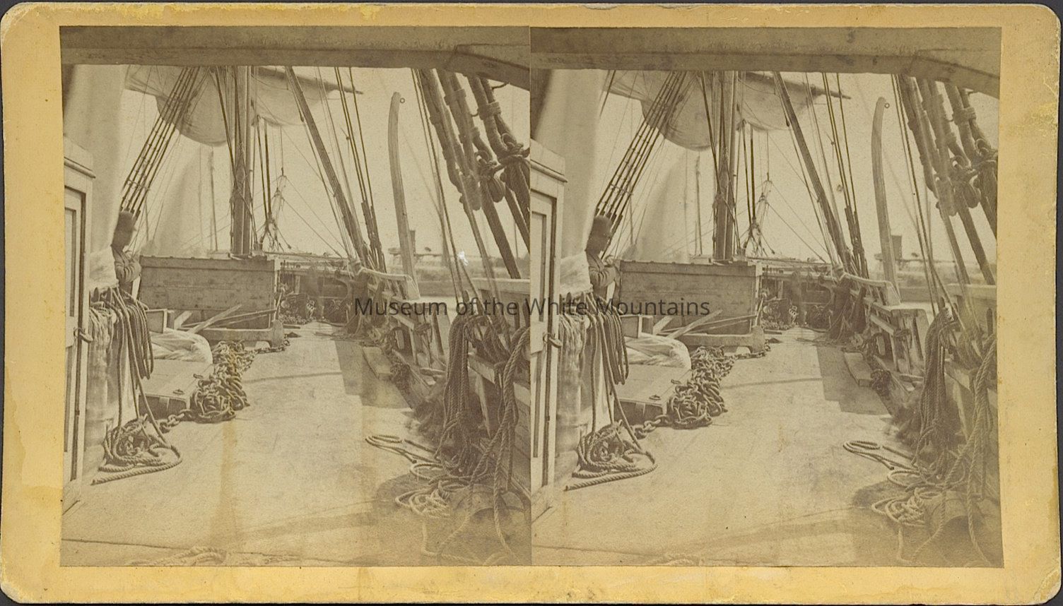 Black and white image aboard a ship. Back Description: Plain
