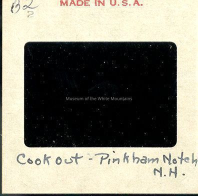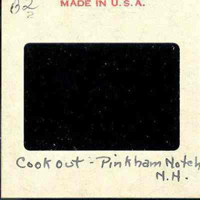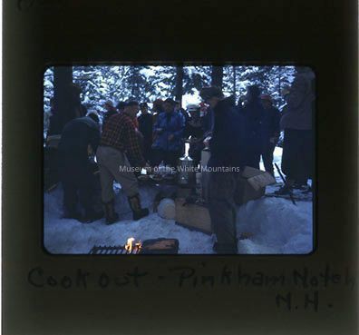 People gather around a makeshift table that appears to have hot drinks of some sort. A man stands in the foreground in a dark coat and tan pants, while a man in a red and black checkered jacket serves drinks. The ground is covered in snow and the edge of a fire can be seen in the bottom left side. Tall pines stand in the background. On the back, "Cook out - Pinkham Notch, N.H." and "B2" are written in pen.