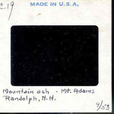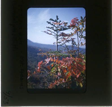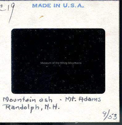Red and green leaves dominate the foreground, with mountains in the background. Red berries hang on the ends of the branches on what seems to be small trees. On the back, "Mountain ash - Mt. Adams Randolph, N.H.", "9/53" and "C19" are written in pen.