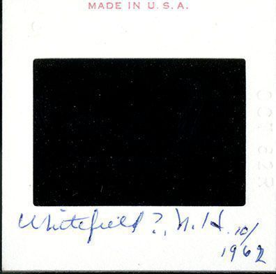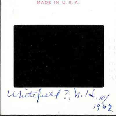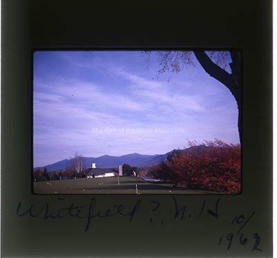What looks to be a golf course, sits on the left side of the image with a large reddish-pink bush to the right. The side of tall tree sits along the right side of the frame. In the background, is a white building surrounded by trees. Only the top of it is visible. Mountains can be seen in the distance. On the back, "Whitefield ?, N.H. 10/1962" is written in pen.Collection