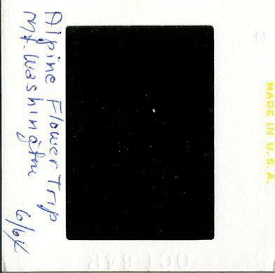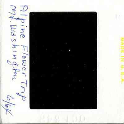 Short branches and green leaves are dotted with small, white flowers. Tufts of grass can be seen in the foreground and bushes are in the background. On the back, "Alpine Flower Trip Mt. Washington 6/64" is written in pen.