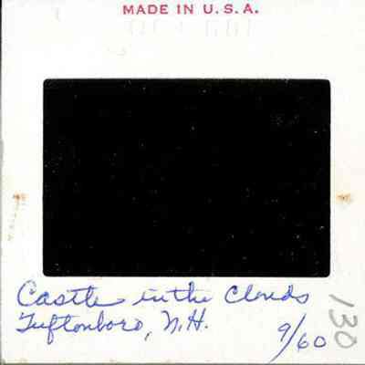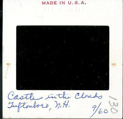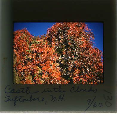 What appears to be a large bush, has its branches and leaves draped over a rock. The bright red leaves dominate the photo. Underneath the red leaves, are some green leaves. On the back, "Castle in the Clouds Tuftonboro, N.H. 9/60" and "130" are written in pen.