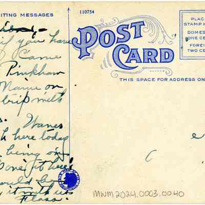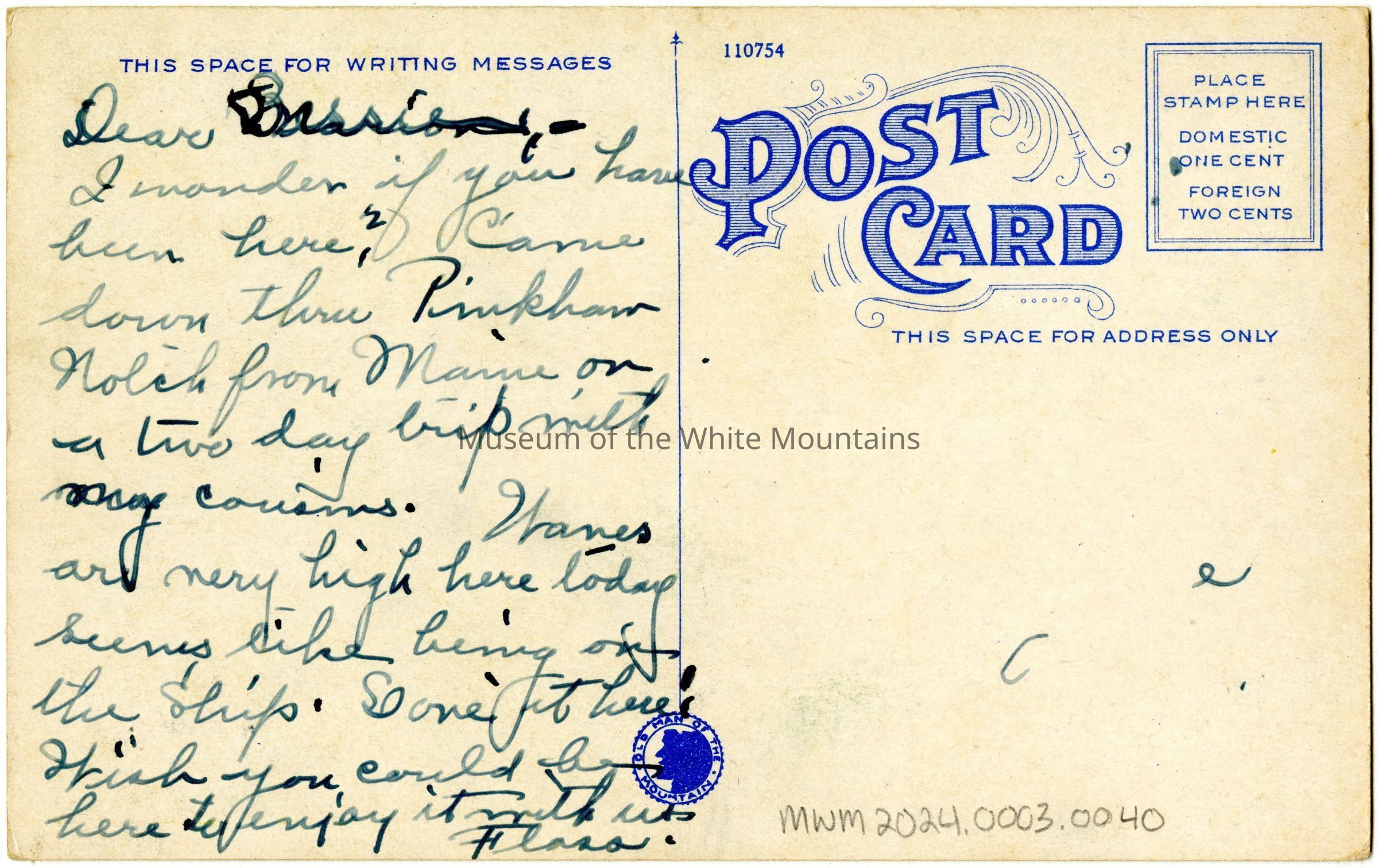 Transcription: Dear [?]- I wonder if you have been here? Came down thru Pinkham Notch from Maine on a two day trip with my cousins. Waves are very high here today seems like being on the ship. Love it here. Wish you could be here to enjoy it with us. [Flora]