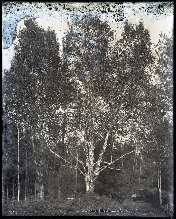 View of a birch tree with multiple trunks. The emulsion layer is peeling around the edges of the photograph, but the image is still quite clear and sharp.