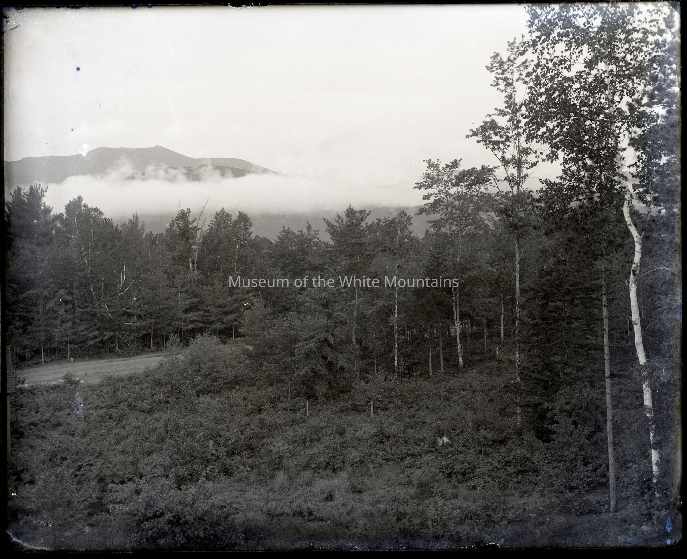 View of a small clearing and trees. On the left side of the image is a dirt road; behind the road, a fog covered mountain is visible.