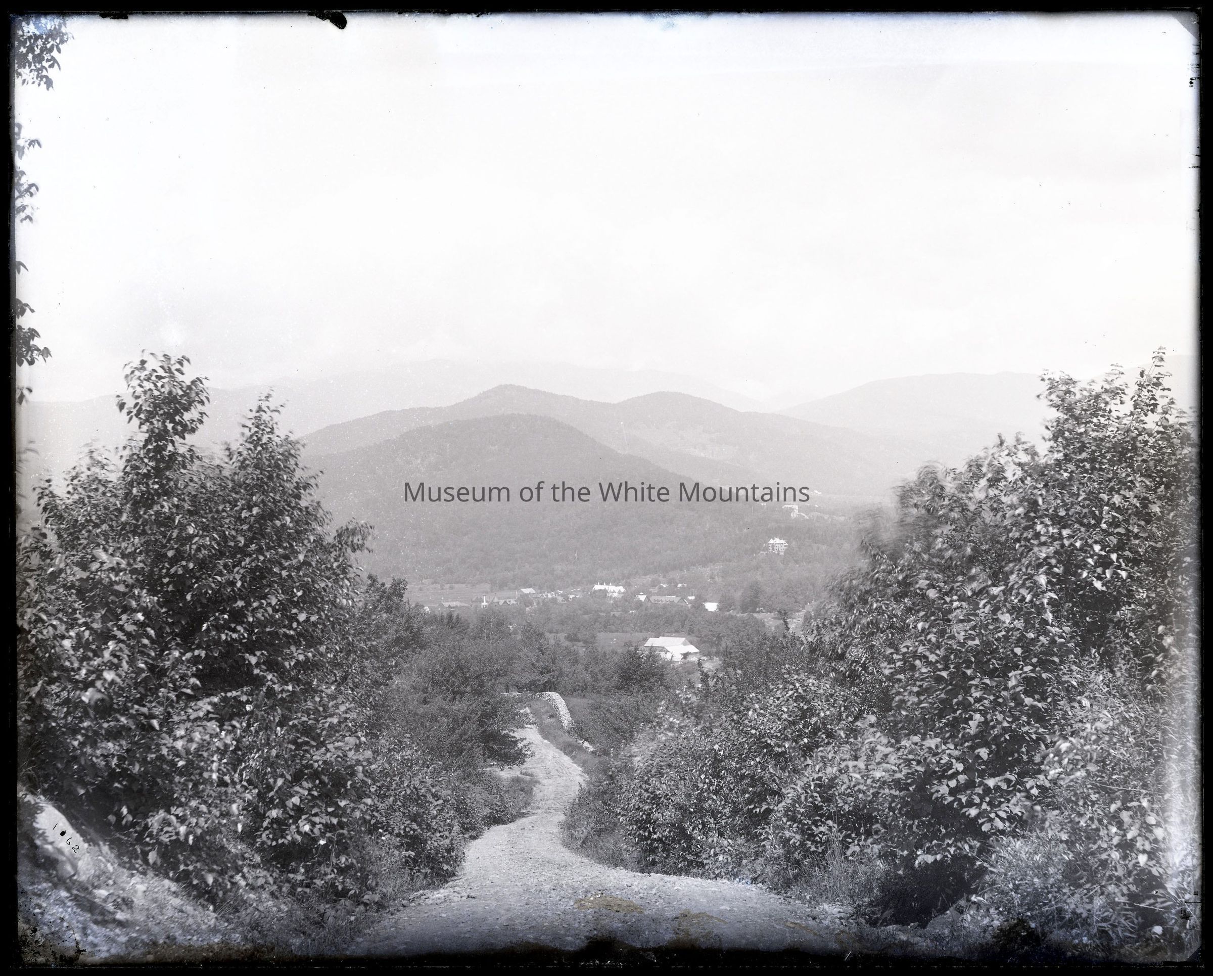 Looking down at Jackson village, with the Wentworth "Castle" on the right and the roofs of the Jackson Falls House and Thorn Mountain House (later Wentworth Hall) at center. Eagle Mountain can be seen in the background.