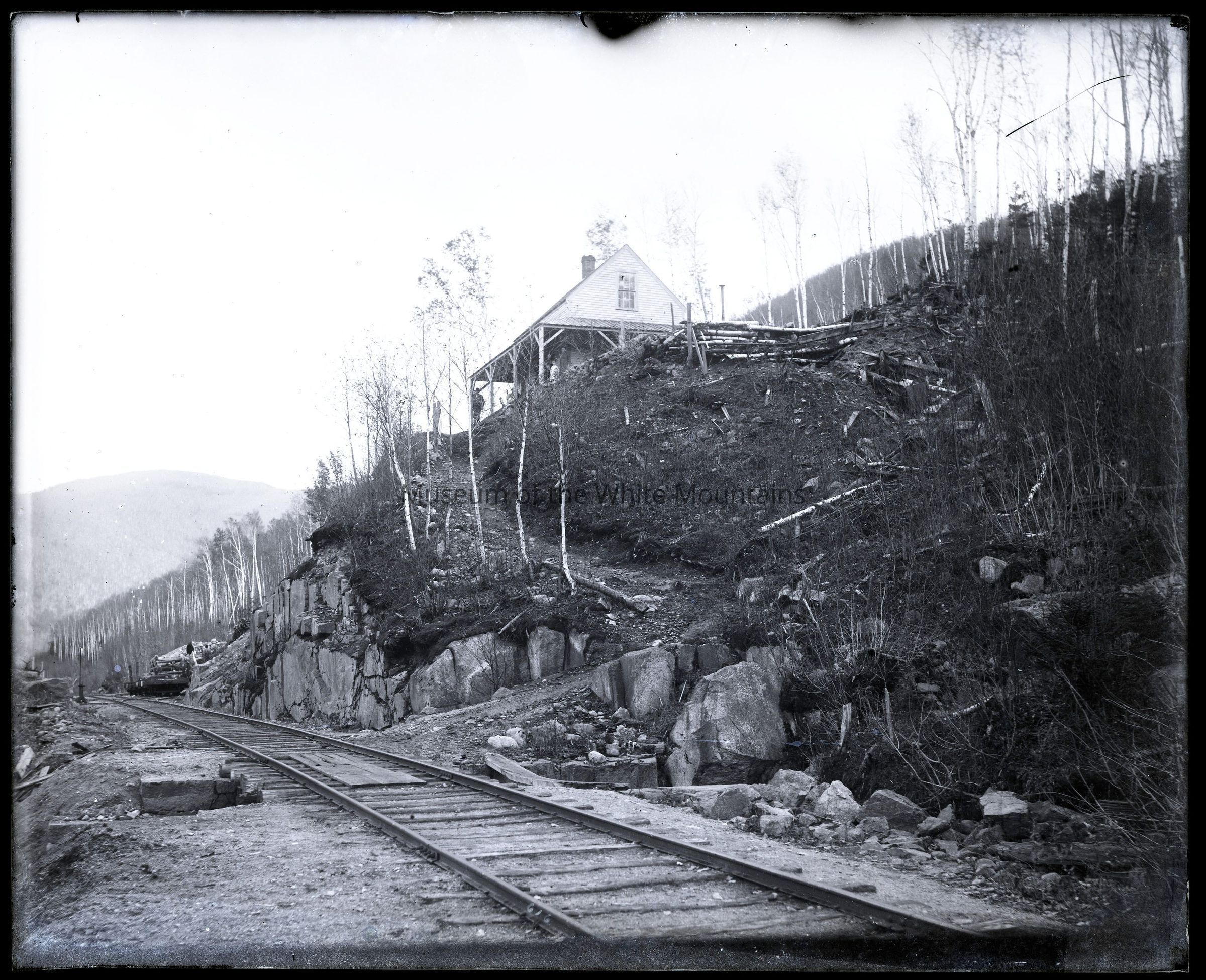 View of a house located in Crawford Notch near the Old Carrigan Station. The house sits on a hill, littered with fallen birch trees and piles of trees. Three people stand in a cluster on the porch and another man with a hat leans against a pole on the other side. A railroad runs in the foreground at the bottom of the hill.