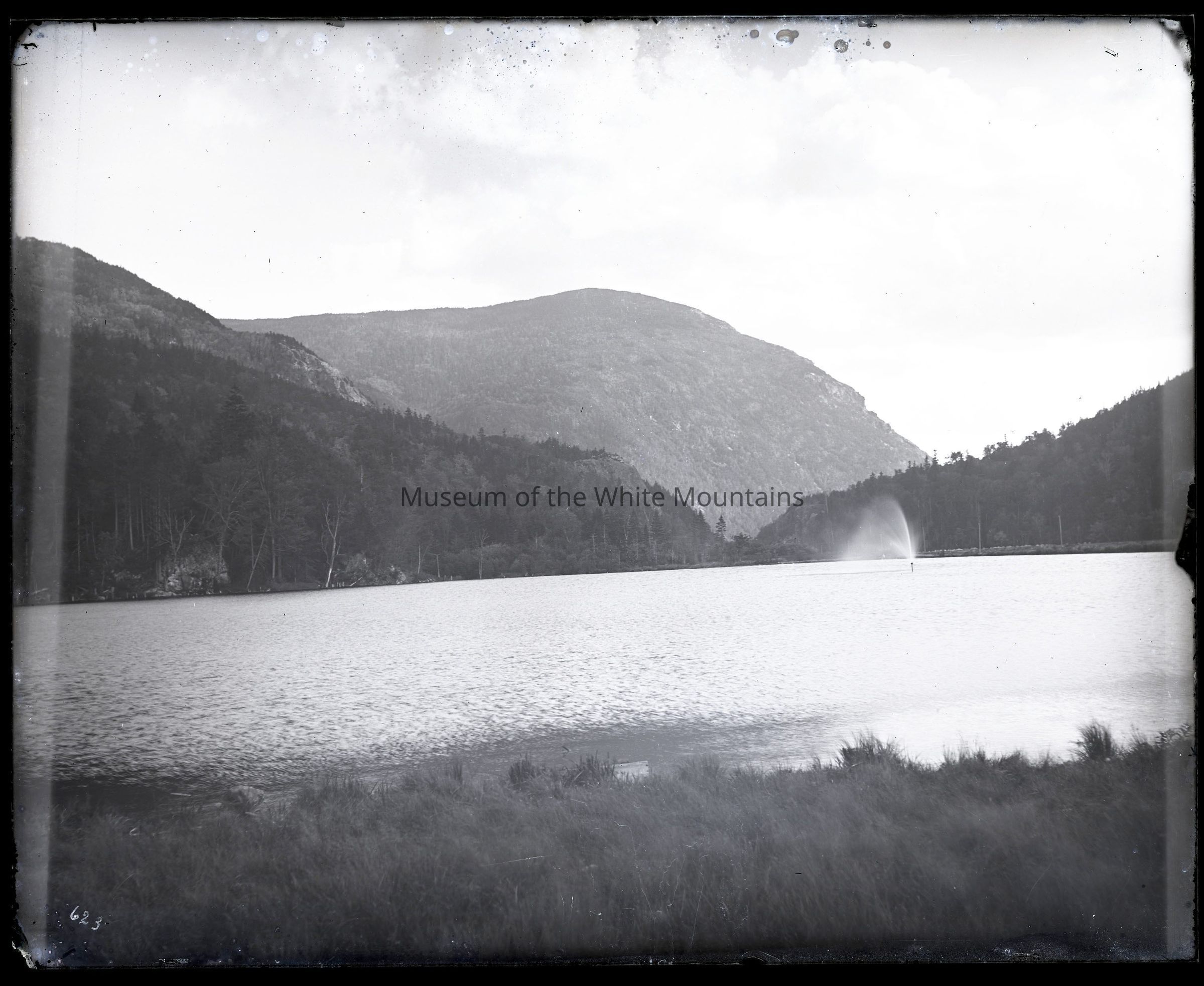 Grass lines the edge of a small lake, with a hill situated to the left and a mountain in the background. The hill has a rock formation that resembles Elephant Head in Crawford Notch. A small fountain springs up in the middle of the body of water and trees cover the landscape.
