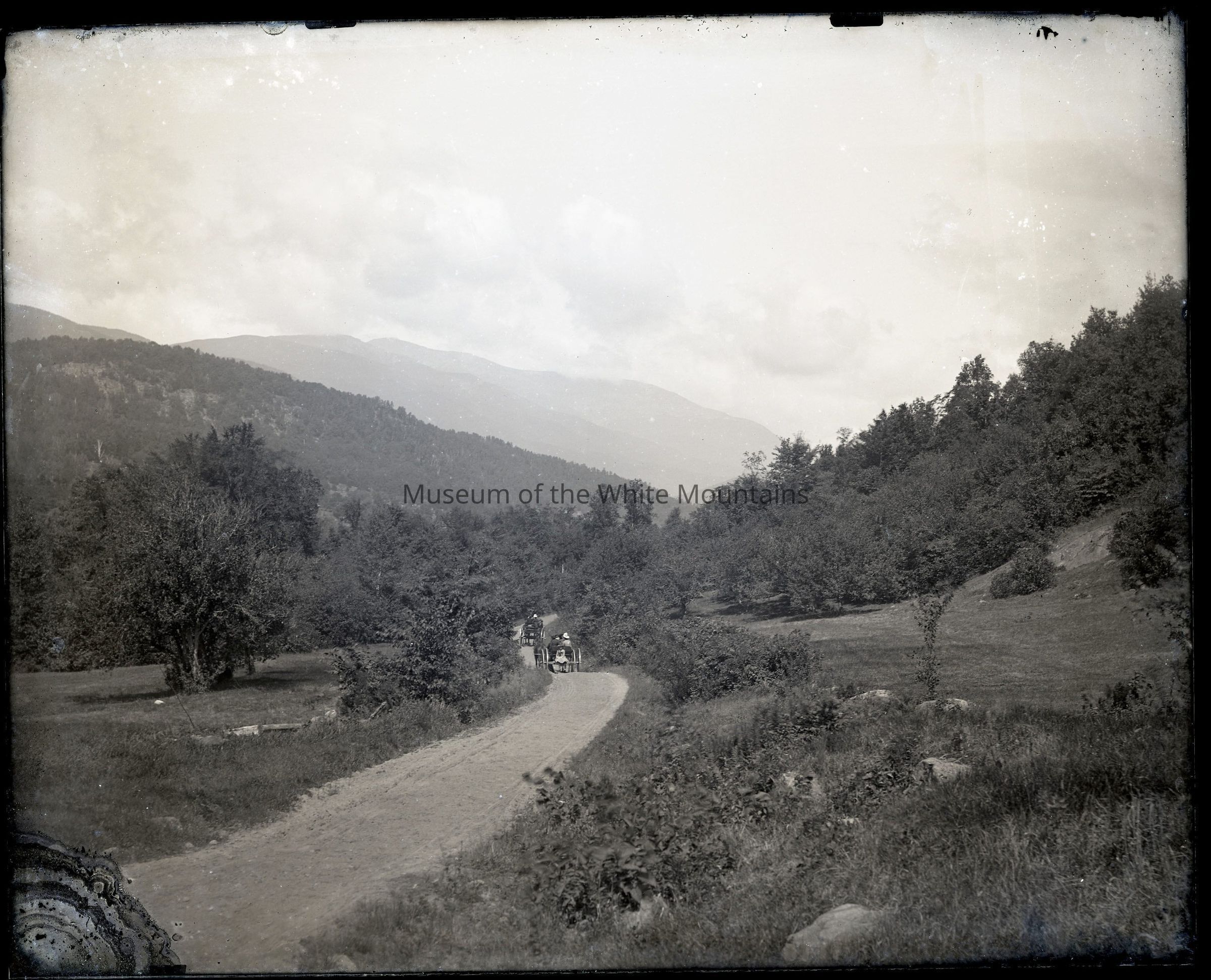 Two wagons with several people, pulled by horses, drive away from the camera on a dirt road. What appears to be a child sits on the back of one wagon. To either side, is thick grass giving way to bushes and trees. Farther back, are hills and then a mountain dominates the background.