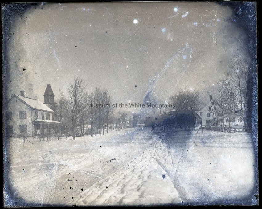 View of a man walking down the middle of a snow-covered neighborhood street. The town appears to be downtown Conway. Buildings and barren trees line the road.