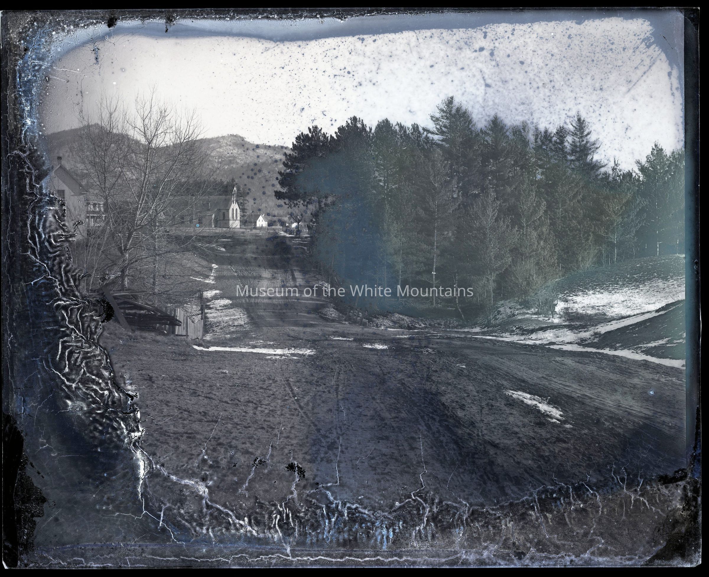 An image of a dirt road leading towards a railroad crossing and a town, also shows small amounts of snow on the ground. Further back, before the buildings, is a wooden sign stating 'Rail Road Crossing' and more words that are indiscernible. There are mountains in the background as well.