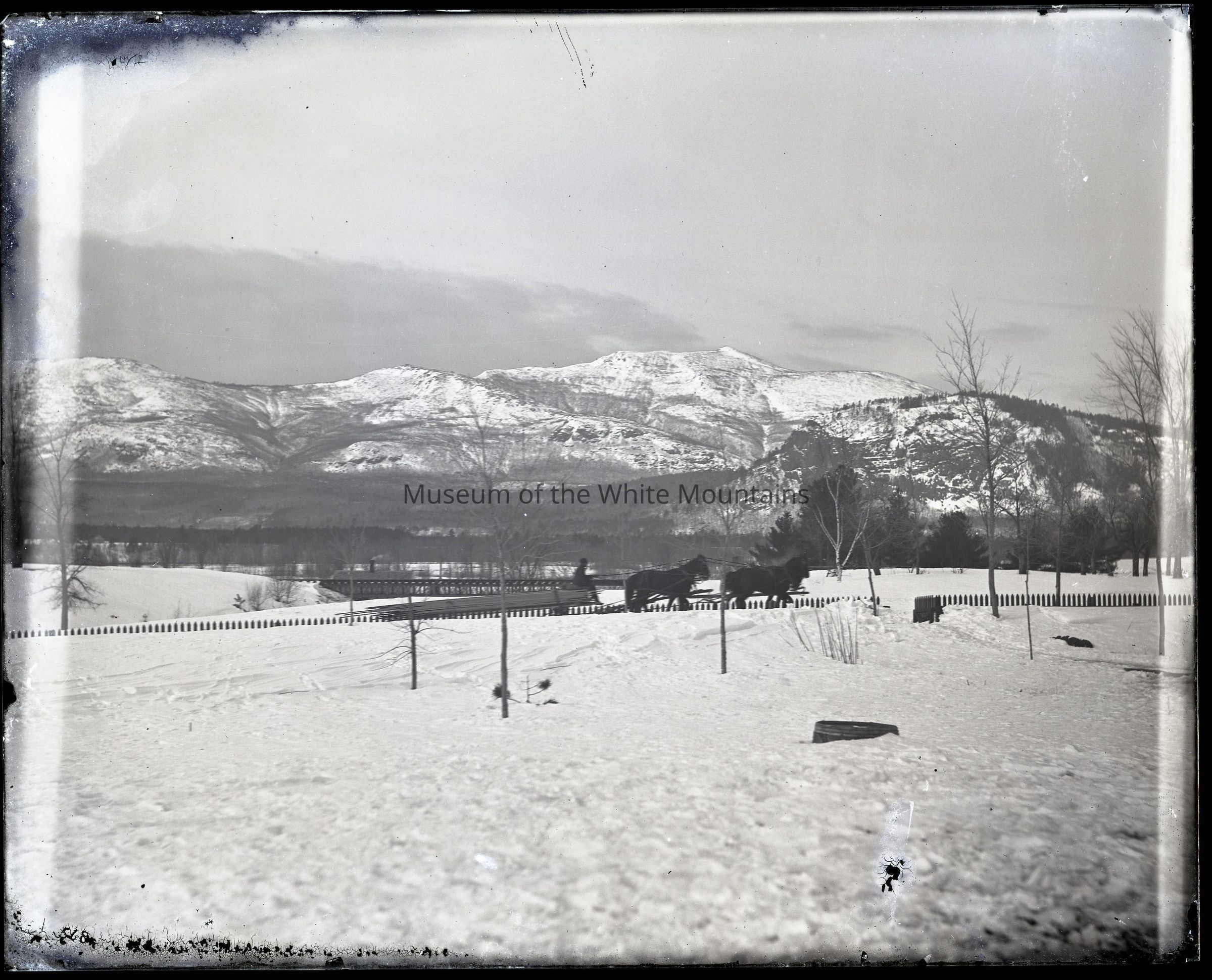 A man drives a sled drawn by two horses in the snow beside what looks to be a fence. A trestle is visible in the background. A small hill sits in front of the mountain and a railroad sits beside it.