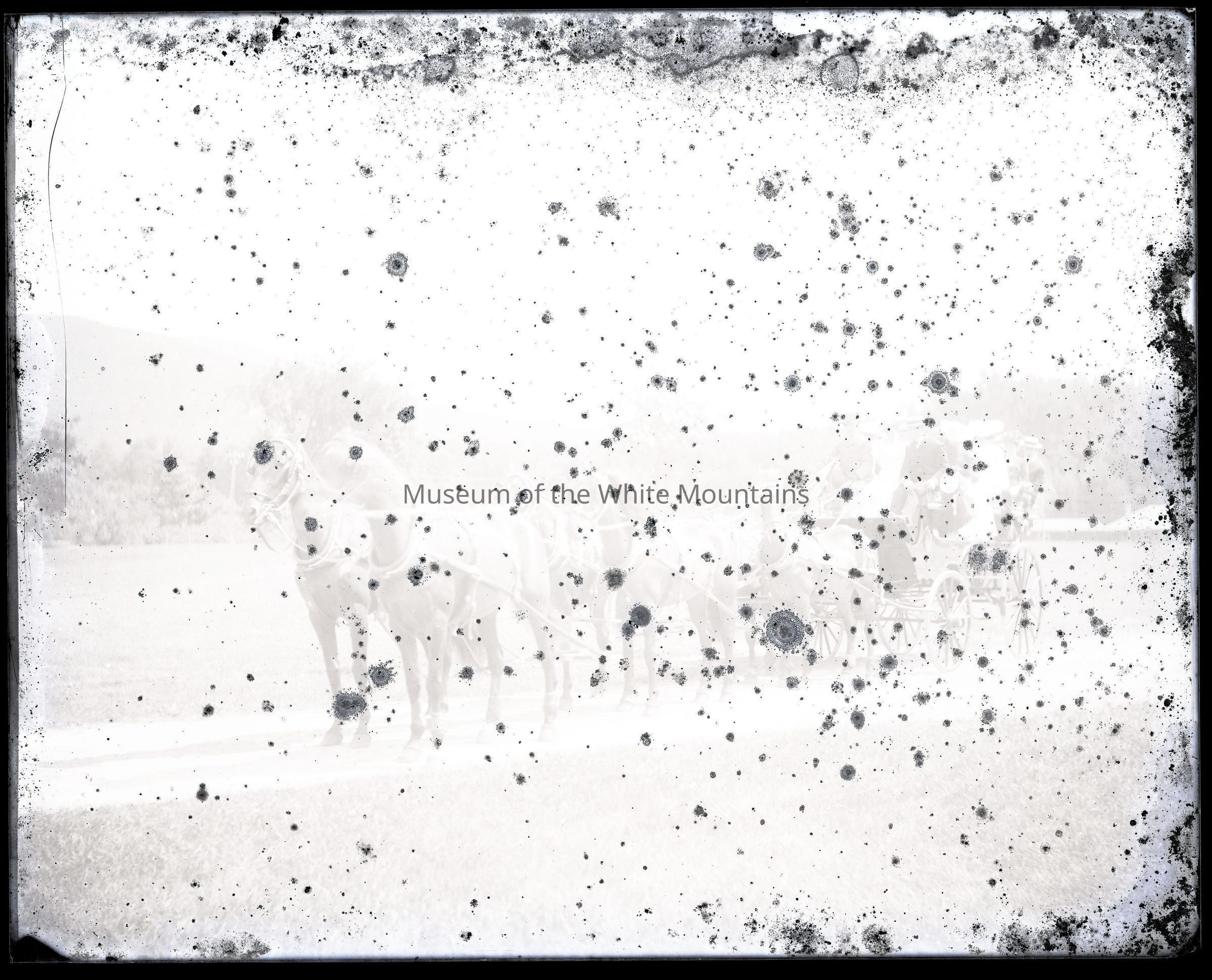 This image is difficult to discern due to the fading and pitting of the emulsion layer. However, several horses pulling a carriage full of people can be seen. The people look to be well-dressed.