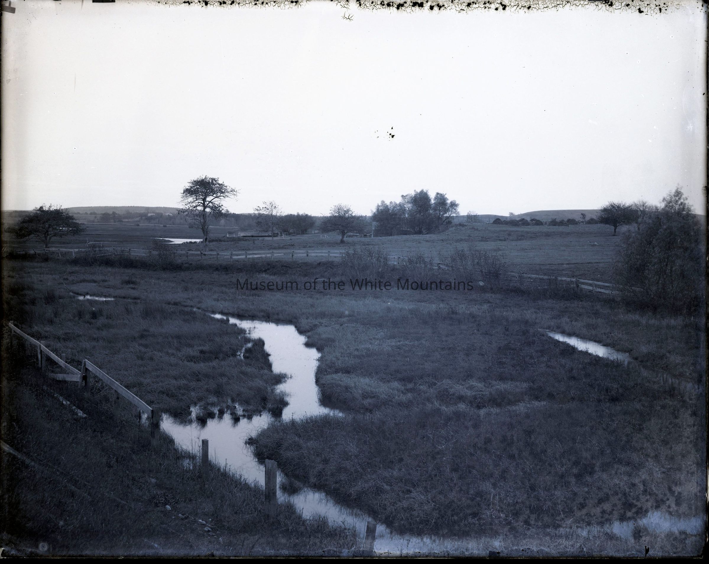 View of a small creek in a field. The field is bordered by a wooden fence. In the distance, a field and houses can be seen surrounded by trees. Small hills can be seen in the background.