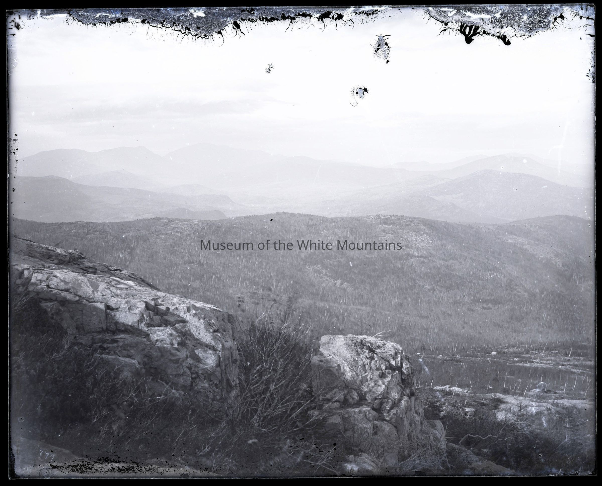 View of mountains and hills taken from the top (or near the top) of a mountain. Rocks can be seen in the foreground and trees cover the mountains.
