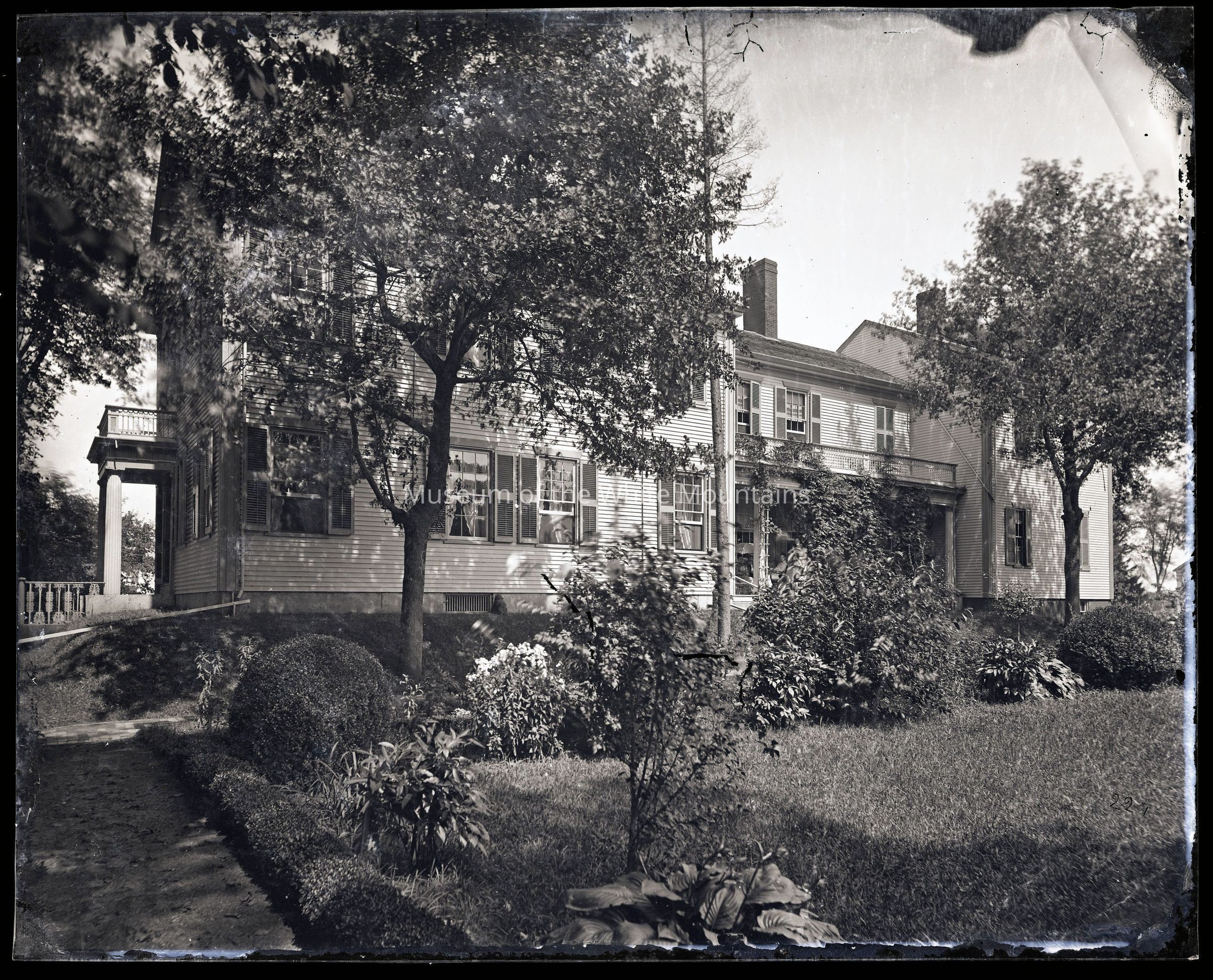 This image depicts a two story house with trees and bushes planted in the yard. A path on the left side goes around the yard. On the right is a porch with four people standing and sitting. One woman has an umbrella open over her head. The large windows have curtains pulled to the sides.