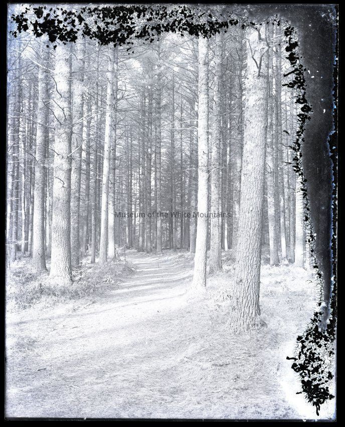 View of the a dirt path in the woods surrounded by pine trees. A dirt path runs underneath the branches of trees lining the path. Pine needles and grass cover the path.