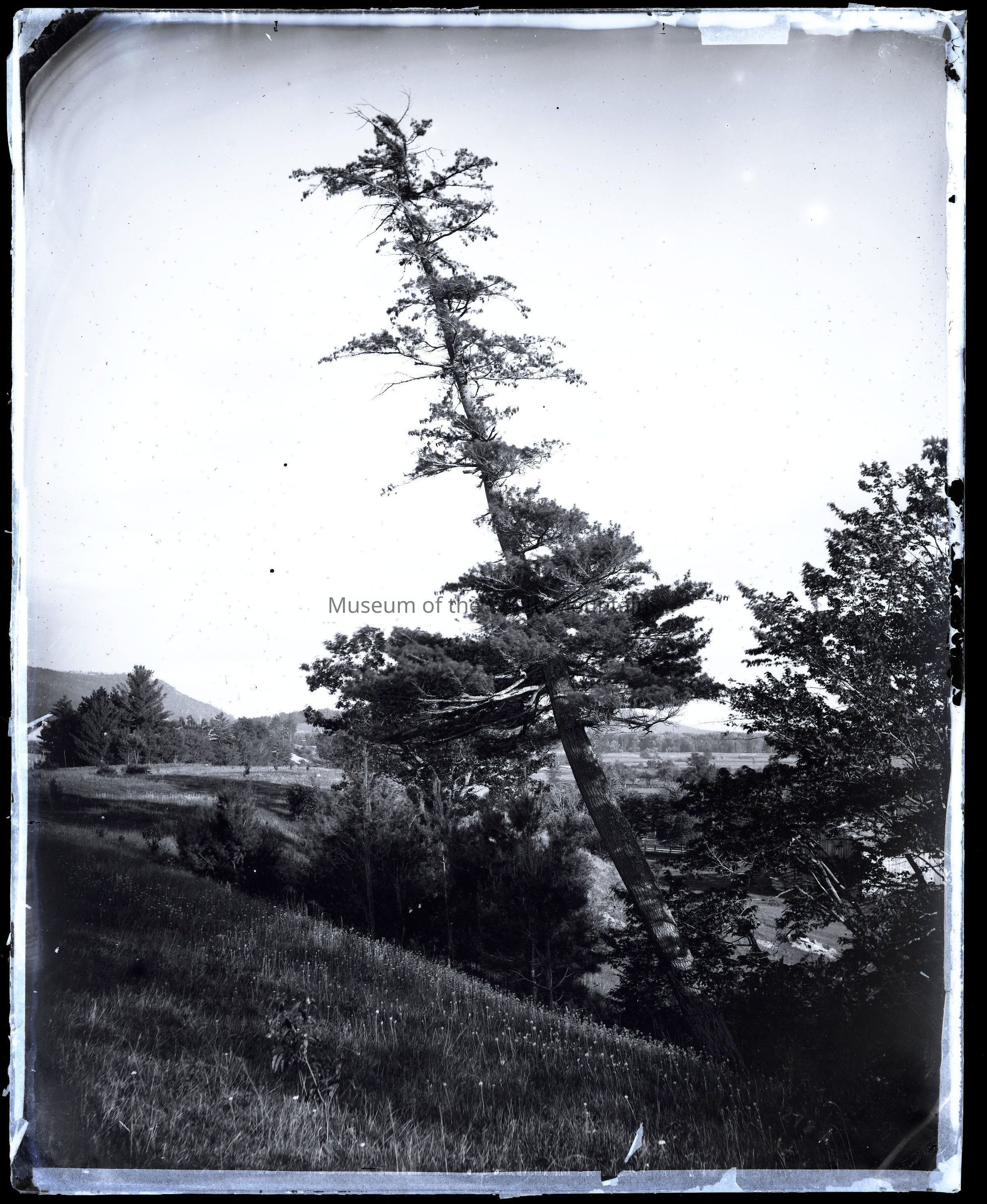 A tall tree leaning to the left dominates the image, with other smaller trees at its base. In the distance, fields and fencing can be seen. Houses/buildings are visible through the trees as well as a mountain in the background.