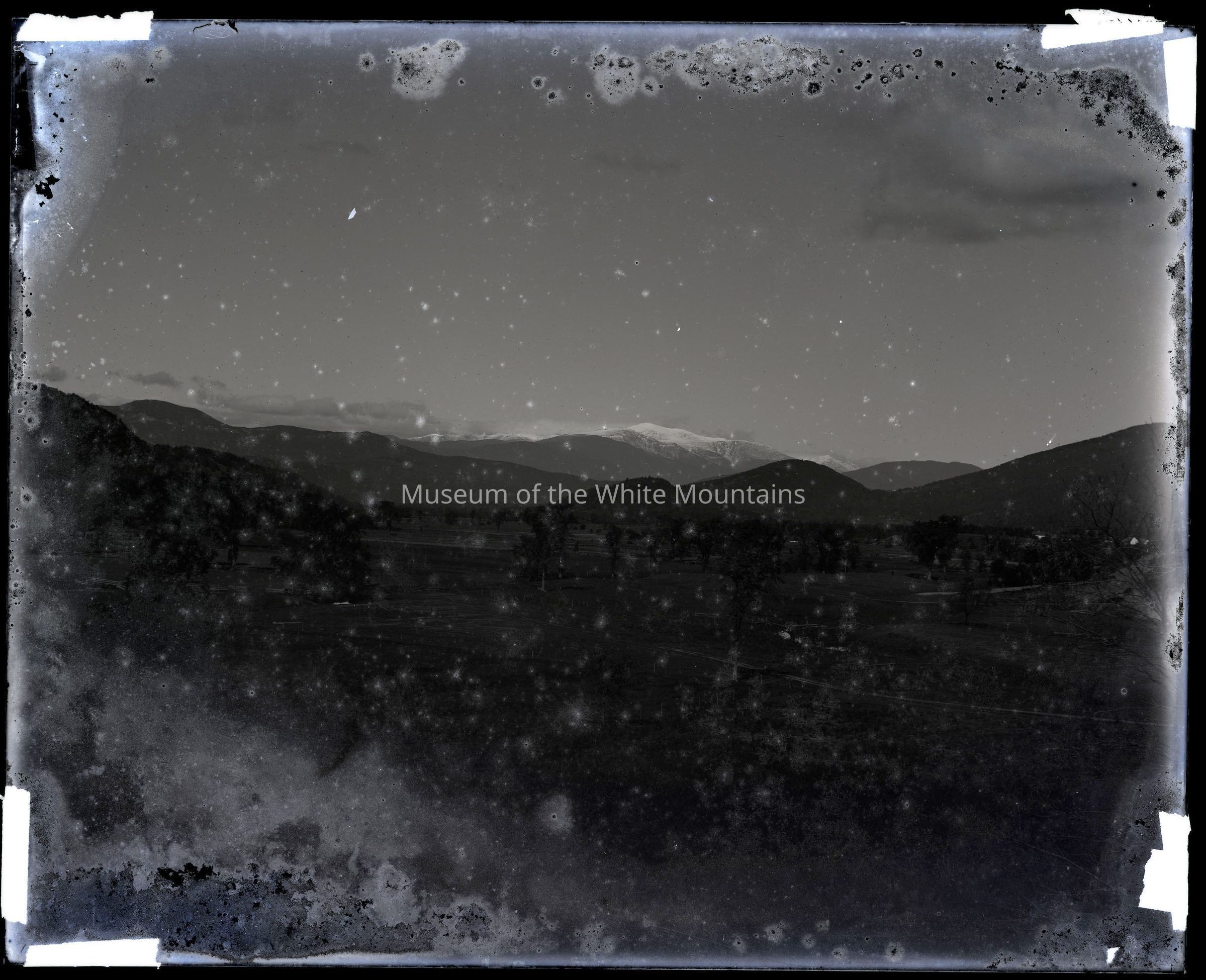 A very dark image of a snow covered Mount Washington as well as the outlines of other mountains. Clouds can be seen around the summit.