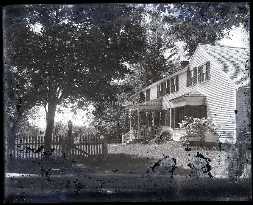 View of a two story house with dark shutters and a small porch leading to the door. On the porch are two wicker chairs which face out and to the left. A flower bush grows next to a bay window. In the foreground is a dirt drive, wooden split-rail fence, lamp, and two trees. In the background, there are more trees and bushes.Collection