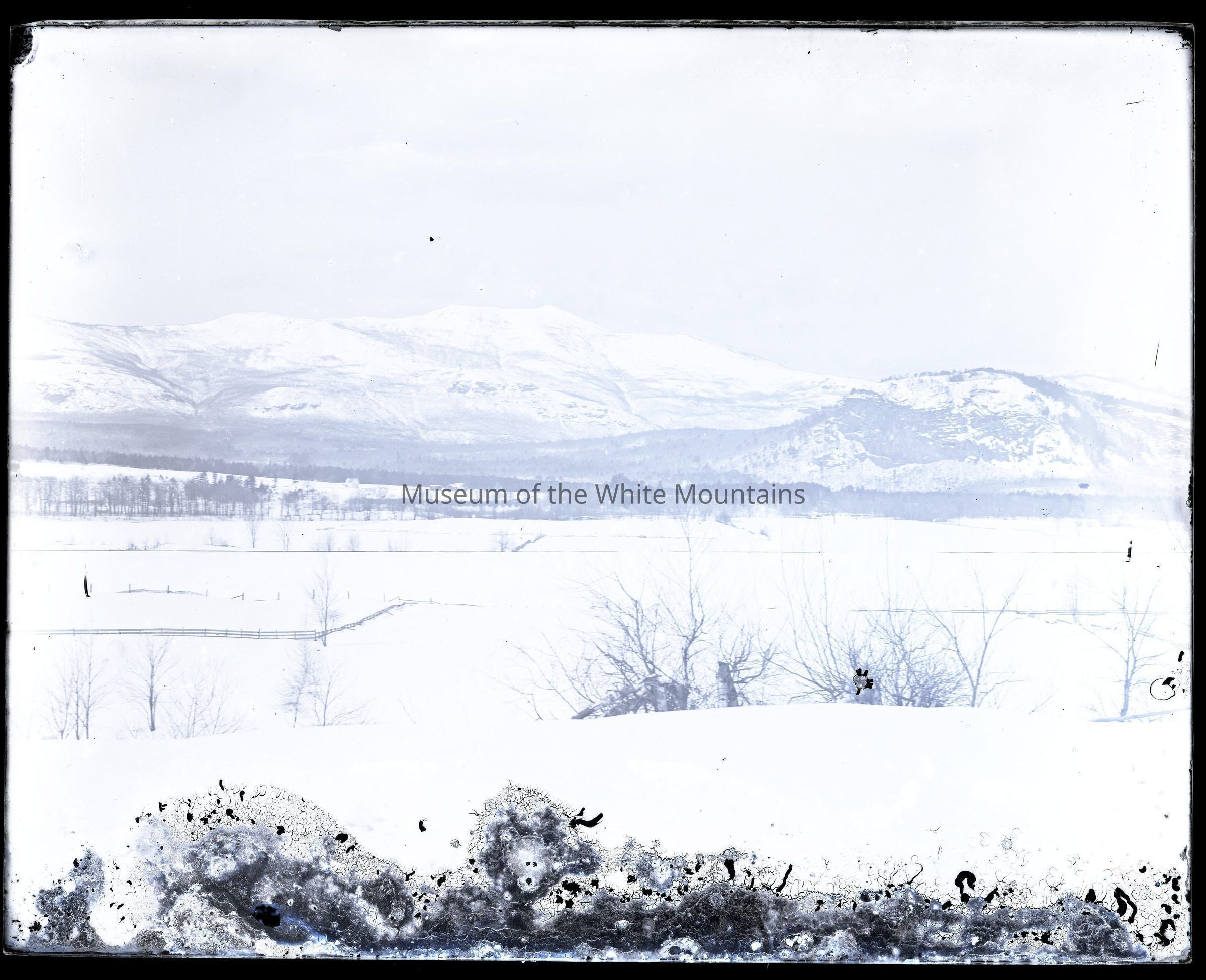 View of a field in winter. In the background, Mount Washington is visible. Fences can be seen in the snow and dormant trees line the field. There appears to be on a small hill and a house and barn are visible in the distance.