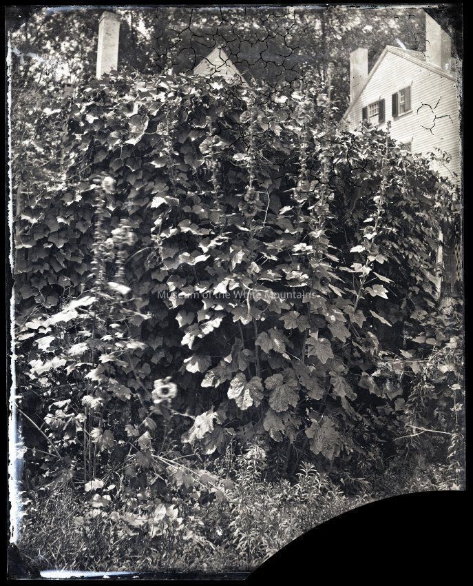 Tall stalks of leaves and flowers (possibly a bean plant) dominate the image with smaller plants sprouting at their bases. In the background, the tops of two houses as well as their chimneys are visible with tall trees behind them. The bushes seem to be draped on a fence or trellis as wooden boards can be seen on either side of the plants.