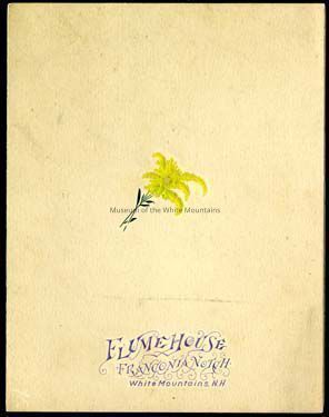 Item is a cream colored, vertical fold, menu from the Flume House. The cover features a small bunch of yellow flowers and the words, "Flume House, Franconia Notch, White Mountains, NH." Image and words are raised.