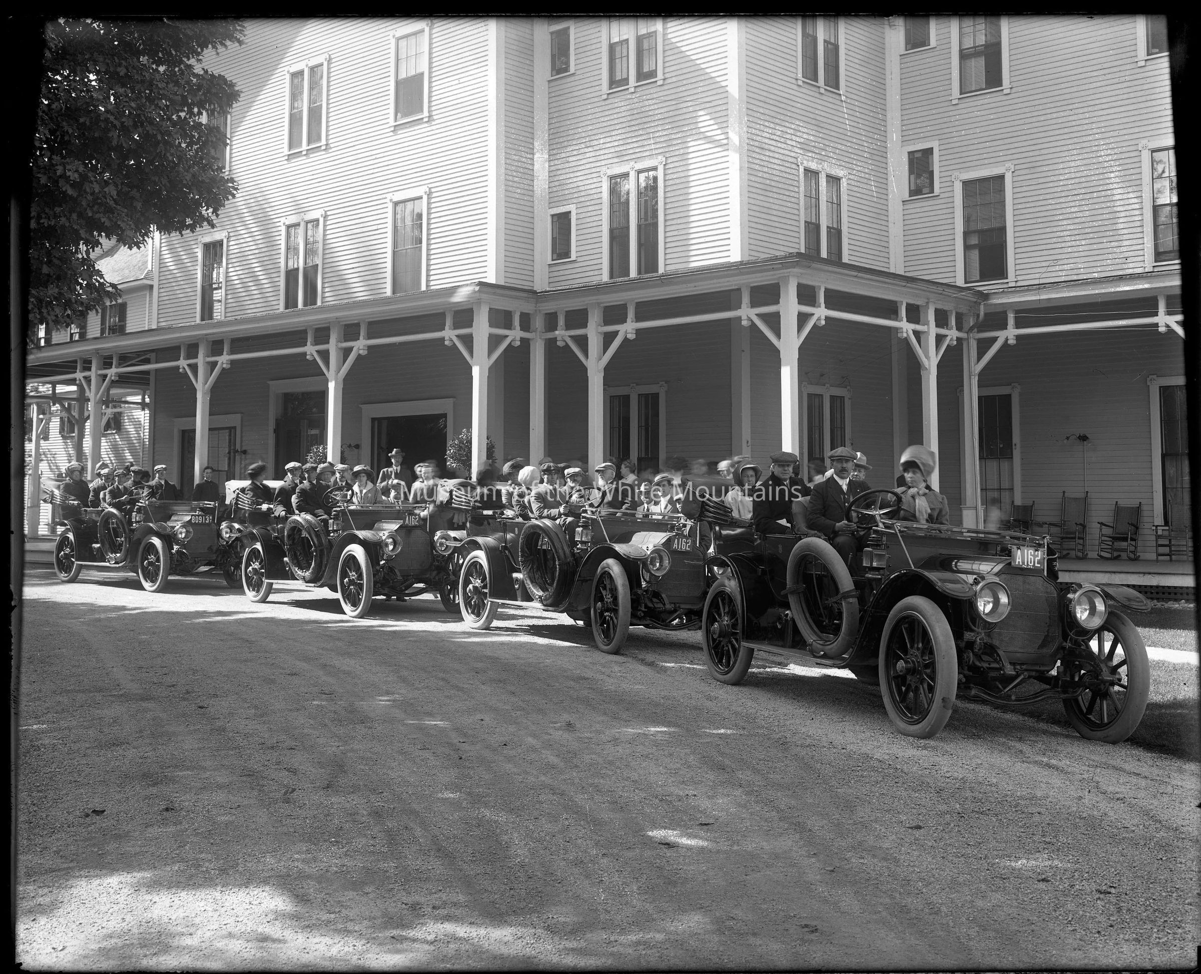 View of automobiles lined up in front of the porch of Kearsarge House, a grand hotel in North Conway. Inside the automobiles are men and women dressed in touring clothes. There also looks to be people standing on the porch. The automobiles in which people are riding in all have the same license plate, reading "A162 N.H."
