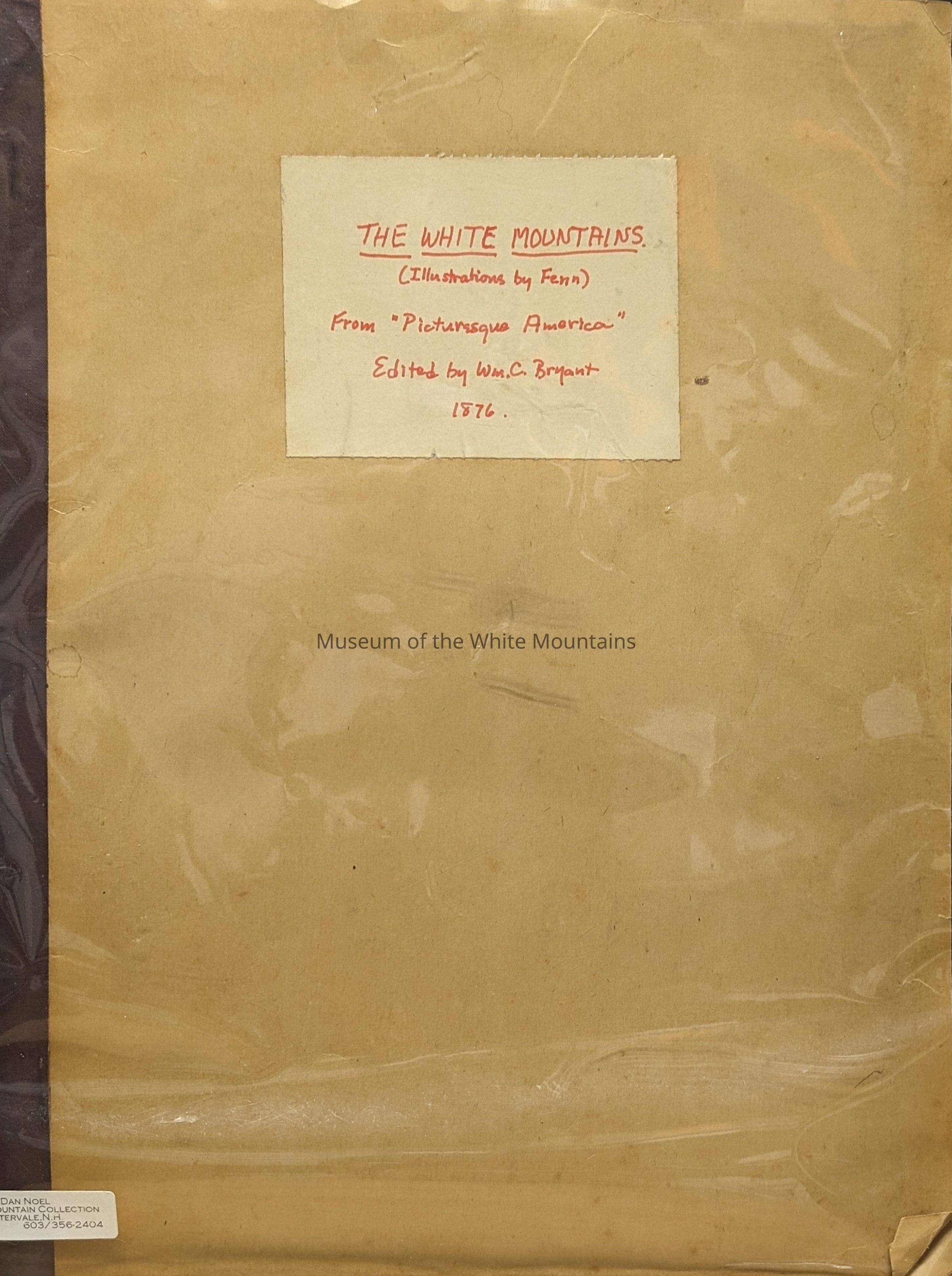 Written on front: Copy of The White Mountains (Illustrations by Fenn) from "Picturesque America". Edited by Wm. C. Bryant. Includes articles and black and white illustrations of White Mountains subjects. Item may not be complete- missing original cover. Probably Volume 1 of Picturesque America. Back Description: Plain