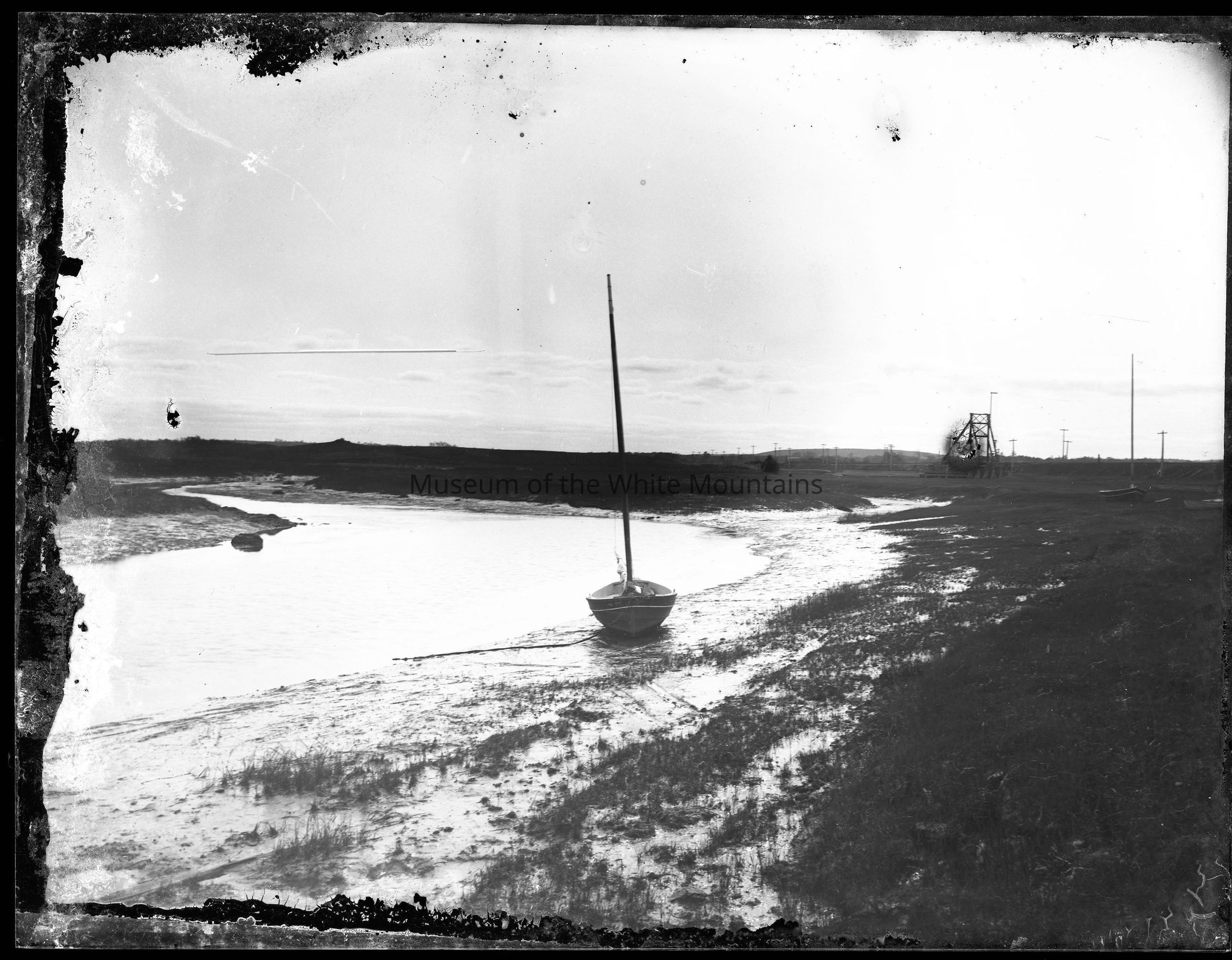 This black and white image shows a sail boat stuck in a grassy march area with what looks to be a river coming through the field. In the back, is what looks to be an oil rig or similar machine. It is possible that this image was taken on the coast of New Hampshire or Massachusetts, where the photographer did some work, but the location is unknown.