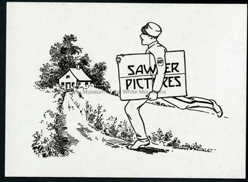 A white advertising card with a black outlined image of a delivery boy in a suit and cap, running with photographic package/parcel. The package includes the words that read "Sawyer Pictures" and the boy's uniform reads the letters "ADT" on his left arm. The boy is running up the path outlined with flowers, bushes and grass to a small house. The house has a small door, five windows, one chimney and a small fence around its back. The house is surrounded by trees, bushes and the natural environment.