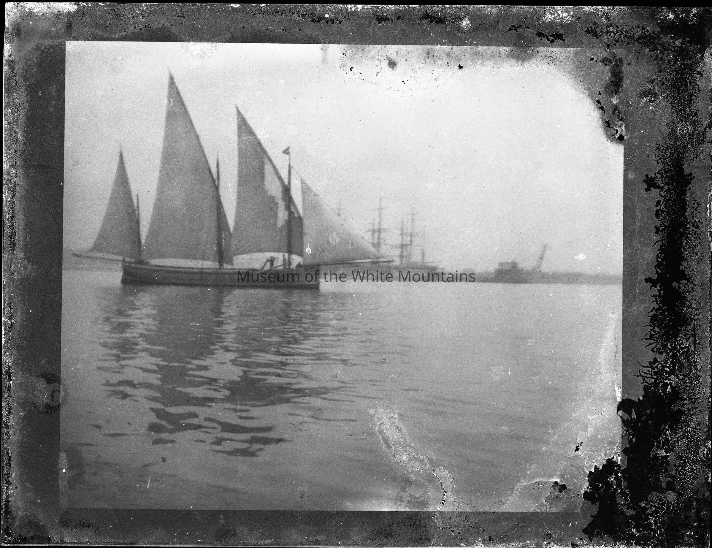 A large sail boat with four sails sit in the water with what looks to be other boats with tall masts in the background. A couple sailors are on the boat with large wooden poles, possibly oars in their hands. The location is unkown.