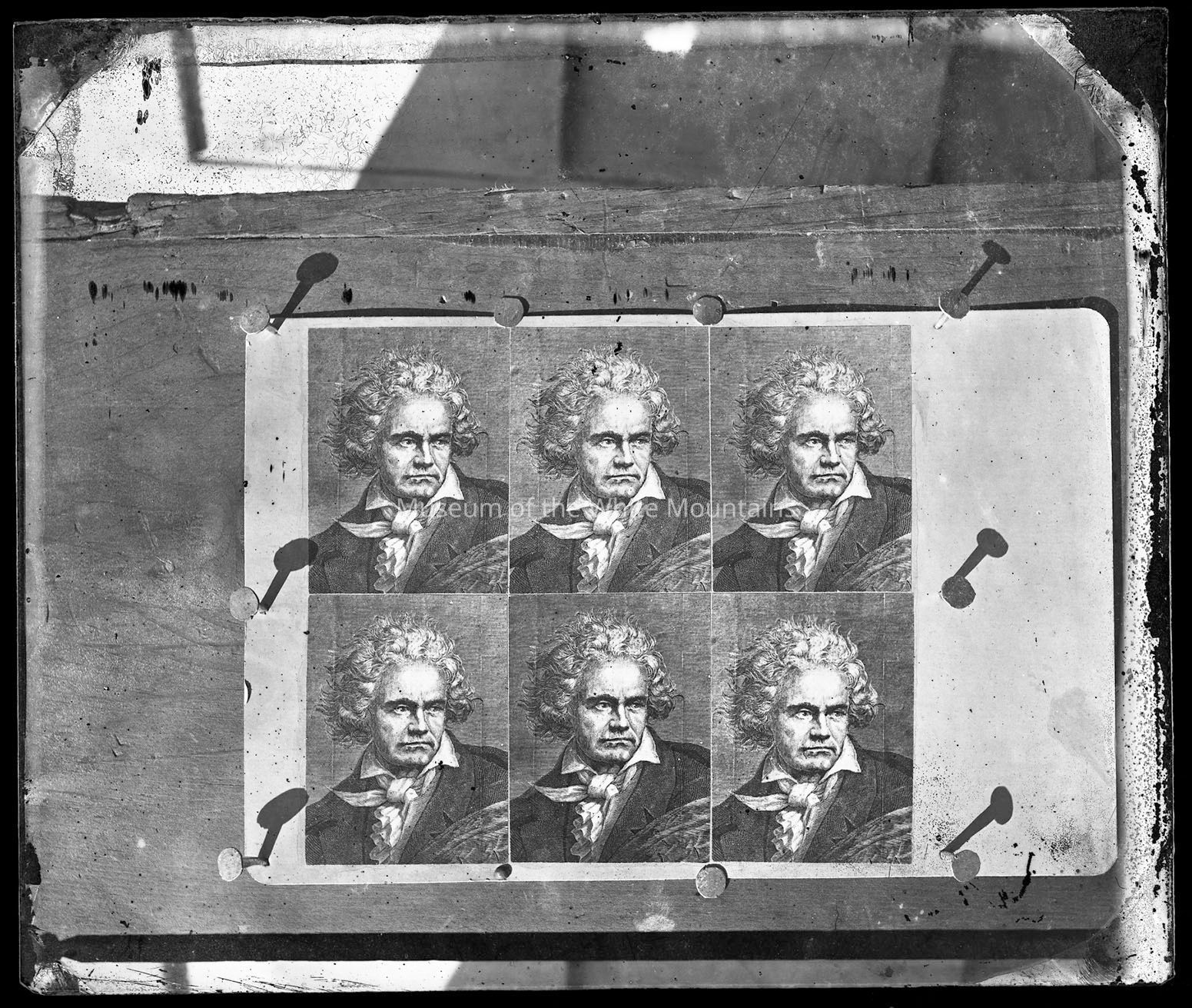 This image consists of what looks to be a card or piece of paper of some sort nailed to a board. This card contains six identical images of German composer and pianist, Ludwig van Beethoven.