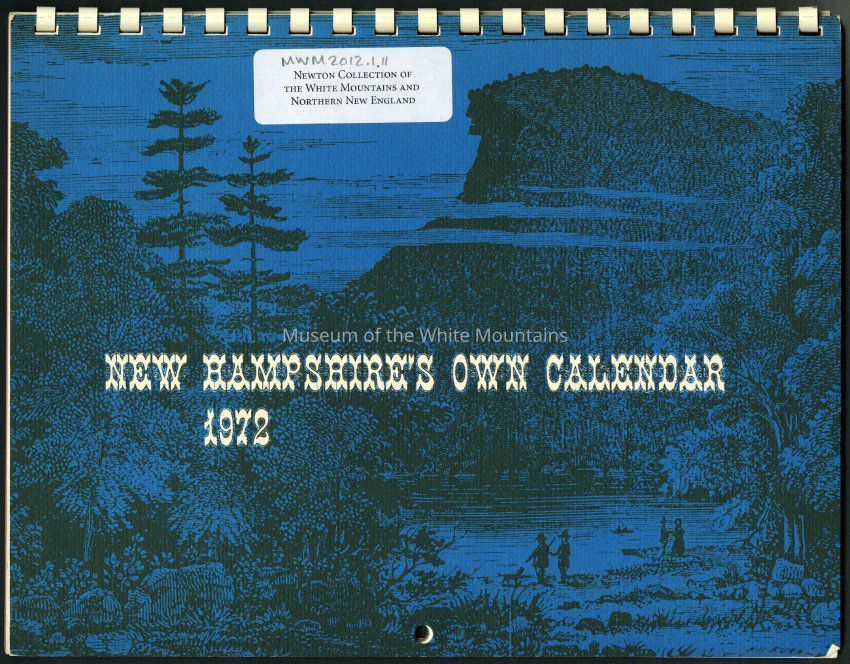 This is a calendar with a breif history of New Hampshire with the days marked with important historical NH events. Each month depicts what appears to be a copy of an original pen and ink image. All images are of different towns, mountains, and landscape scenes, etc.Collection