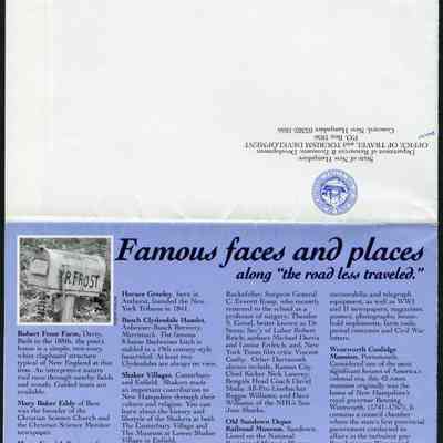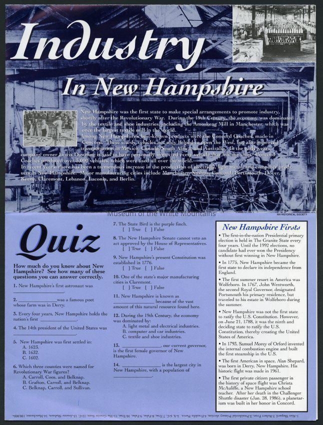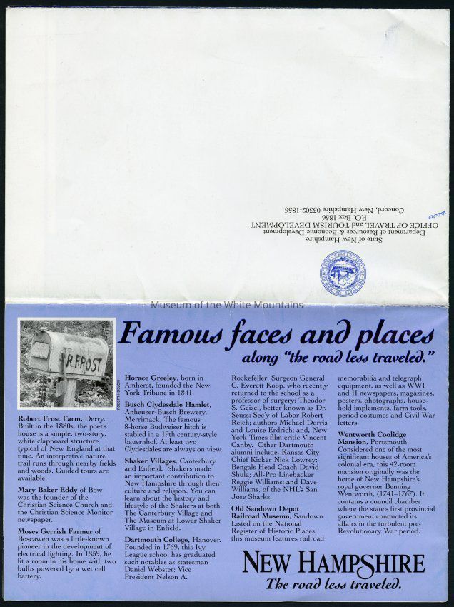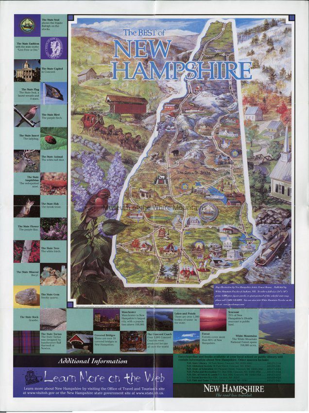 New Hampshire (United States : state), New Castle (Rockingham county, New Hampshire : inhabited place), New Hampshire Historical Society, Concord Coach, Mount Washington Hotel (Coos county, New Hampshire : inhabited place), Cannon Mountain (Grafton county, New Hampshire : peak), Cannon Mountain Aerial Tramway, Santa's Village (Coos county, New Hampshire : amusement park), Clark's Trading Post (Grafton county, New Hampshire : amusement park), Story Land (Carroll county, New Hampshire : inhabited place), Mount Washington Cog Railway, Mount Washington Auto Road, Mount Washington Observatory (Coos county, New Hampshire : inhabited place), Flume, The (Grafton county, New Hampshire : valley), New England Ski Museum (Grafton county, New Hampshire : museum), Polar Caves (Grafton county, New Hampshire : cave), Conway Scenic Railroad (Carroll county, New Hampshire : railroad station), Loon Mountain Resort (Grafton county, New Hampshire : inhabited place), Wildcat Mountain (Coos county, New Hampshire : peak), State of New Hampshire, Department of Resources and Economic Development, Office of Travel and Tourism Development, Mount Washington Auto Road (Coos county, New Hampshire : road)