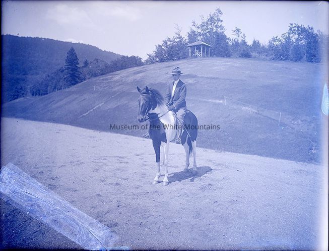 A photograph depicts a man riding a horse on a wide sandy path. There is a sloping hill and a gazebo in the background. The location is unknown; however, the glass plate negative was found with other negatives that depict The Balsams Hotel in Dixville Notch, so it's likely the photo was taken on the hotel grounds. Undated. The lower left hand corner of the negative is broken and was previously repaired with scotch tape which damaged the emulsion layer.