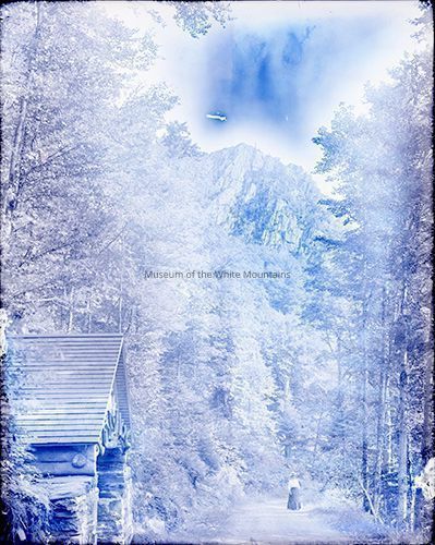 This glass plate negative is possibly a cyanotype, given the blue tint of the image or it may be damage. The image depicts a woman walking along a road leading towards the Spring House at The Balsams Hotel. The Spring House is set into the hillside on the edge of the entrance drive and not far from Route 26. It is a gabled structure set on a base of stacked, flat stones. The roof of the gable is covered with wooden shingles. In the background are mountains. Undated.
