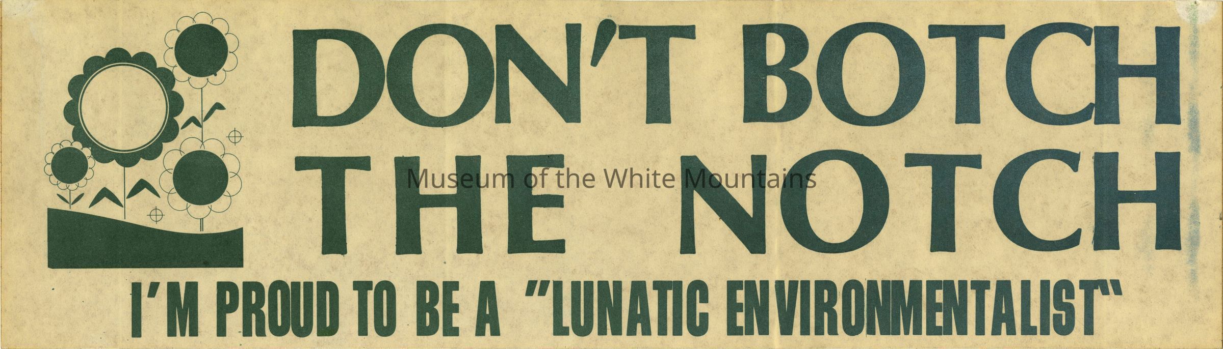 This object is a bumper sticker that reads: "Don't Botch the Notch - I'm Proud to be a 'Lunatic Environmentalist.'" The sticker still maintains its original paper backing and was never adhered to any surface.Context