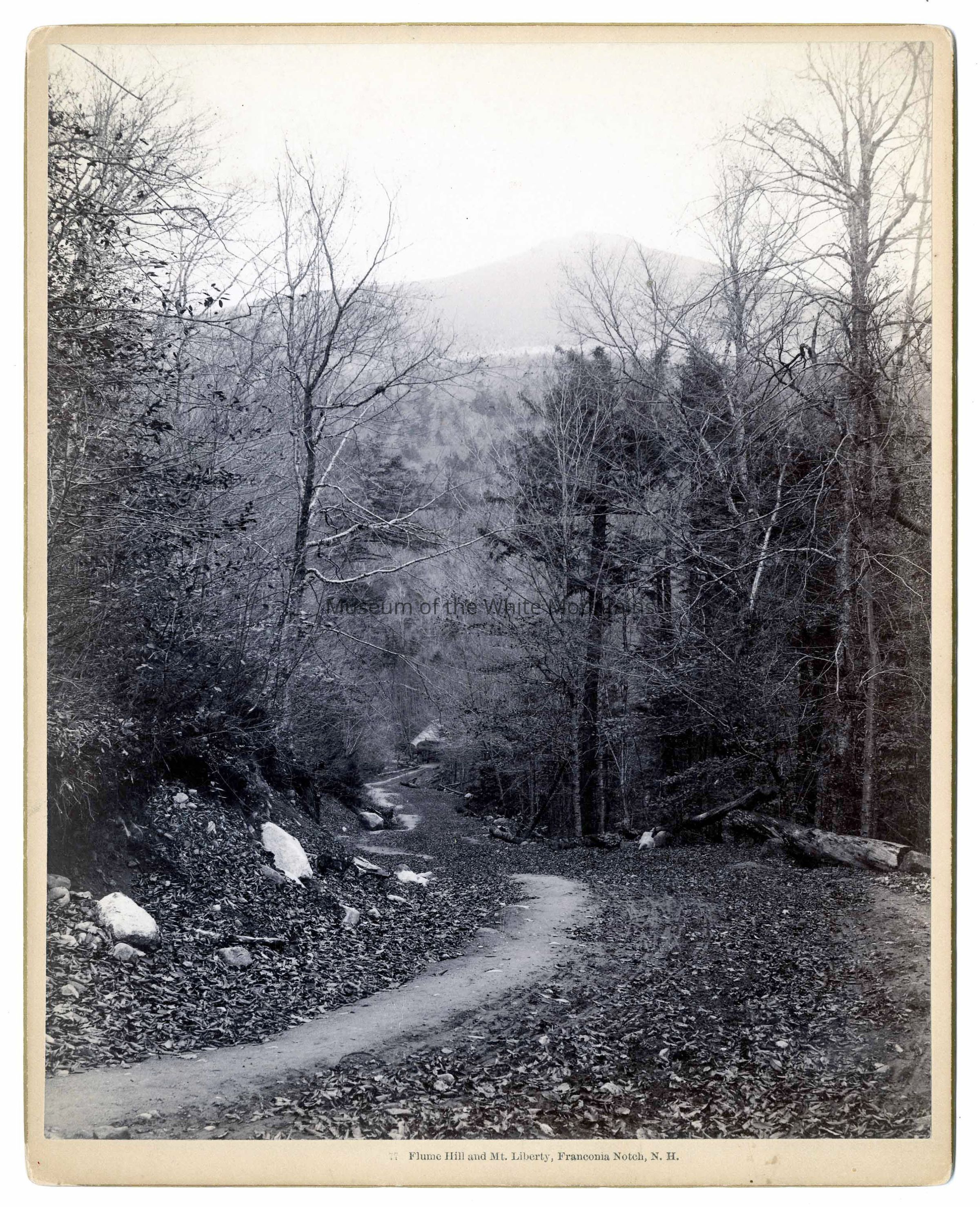 View of path down Flume Hill including the Flume Covered Bridge and Mt. Liberty in the distance.