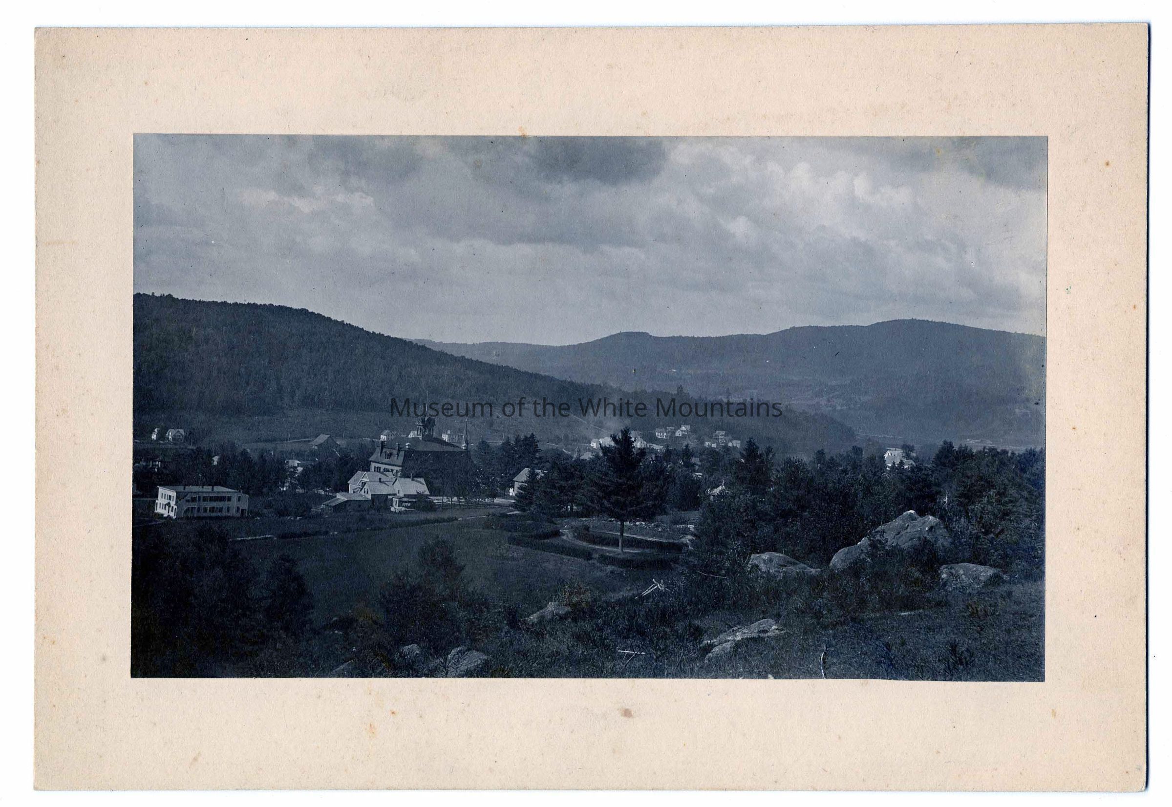 View of town center taken on a hill. Slight areal view. Close up of Unknown town center 1/2.