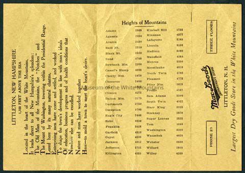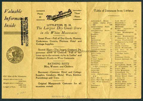 This is an advertisement for MacLeod's Department Store in Littleton, New Hampshire. It contains information about Littleton, including, Littleton's distance from neighboring towns, heights of mountains, a poem, and some facts about the Old Man of the Mountain.Collection