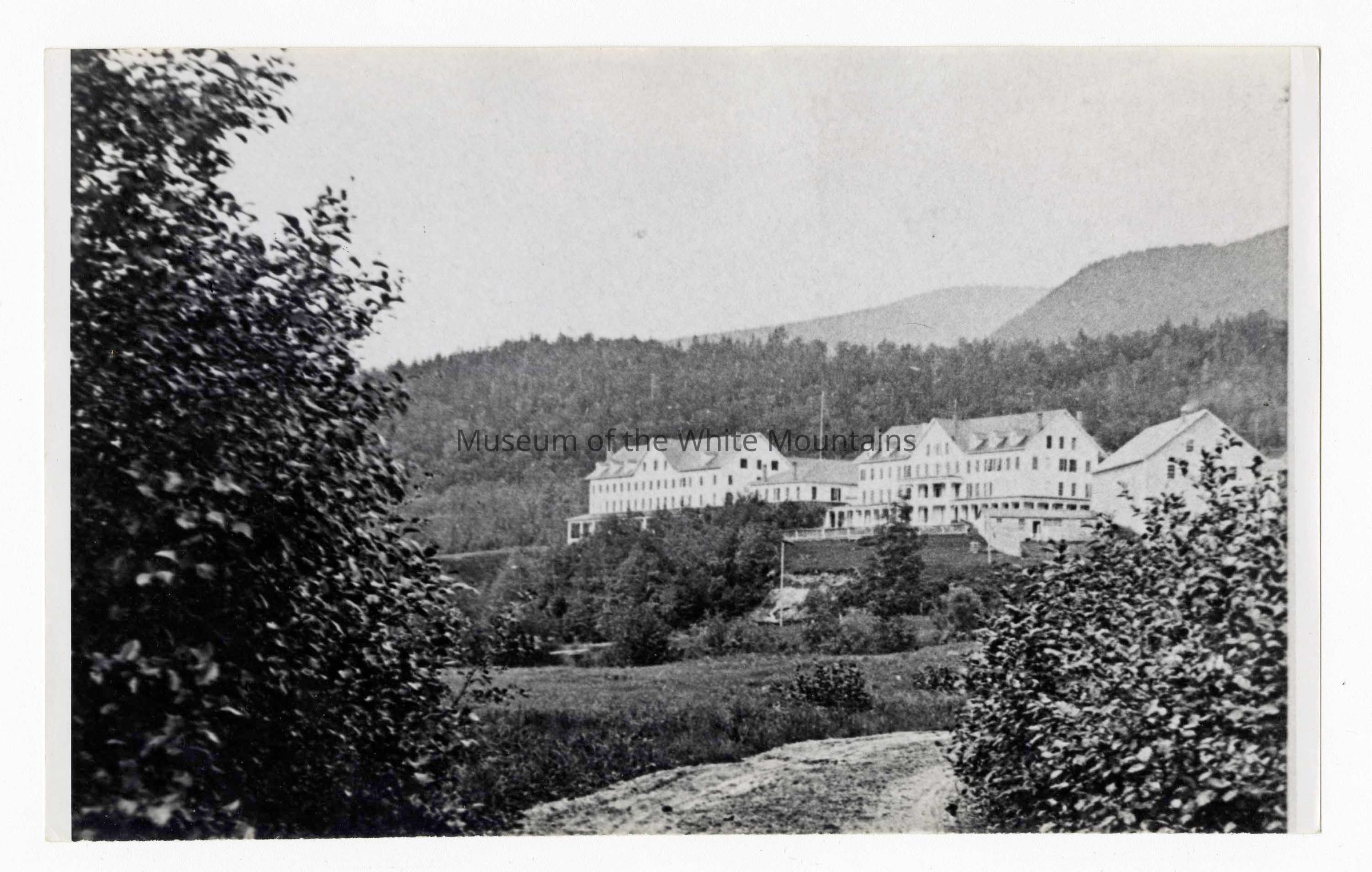 View of front of Glen House from road up to house. About 45 degree off from stright image of front of house. Plants/trees along path covering partial image.