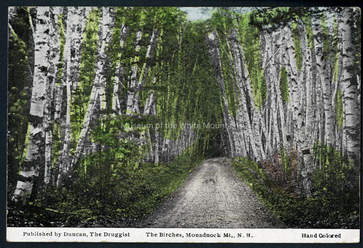 Item is postcard featuring a hand colored photograph image of a dirt road lined with white birch trees and small shrubs on the front. The caption reads, 'The Birches, Monadnock Mt., N.H.' The back side is divided for separate spaces for the note and the address (although it is not written on).Collection