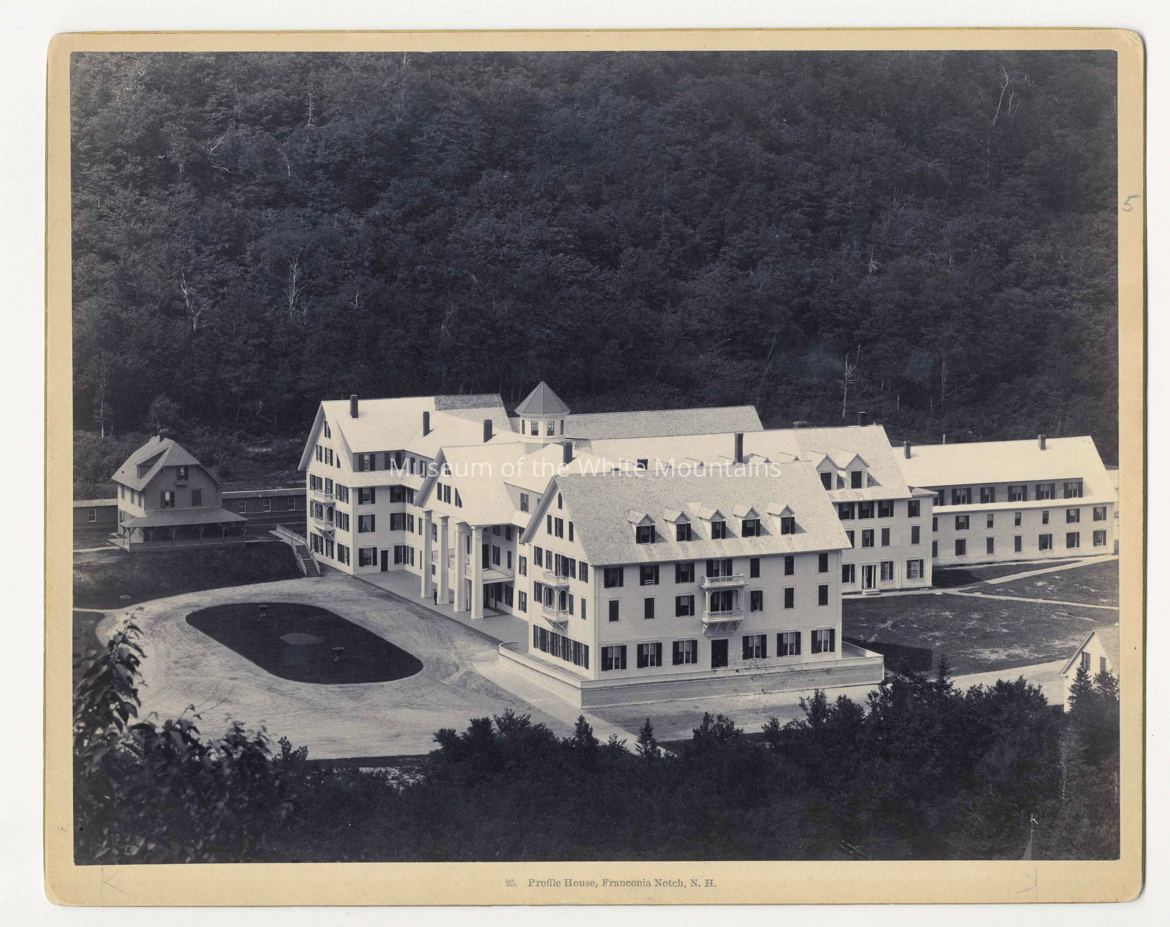Close view of front of Profile House including roundabout infront of house. Taken from angle to house on a hill.