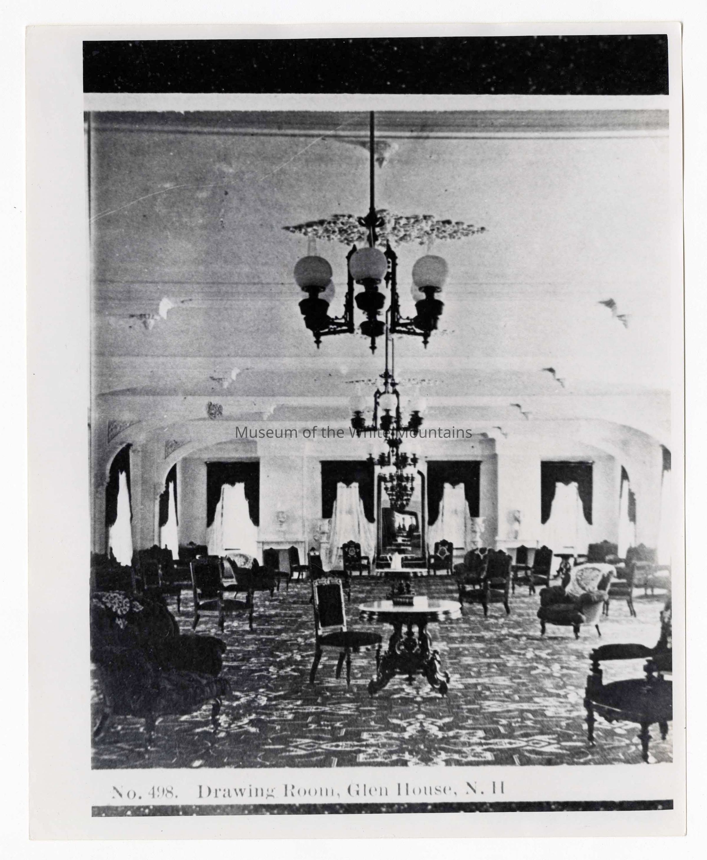 View of The Drawing Room in Glen House. Chairs scattered around room with view of winows along with chandelier. Two copies.