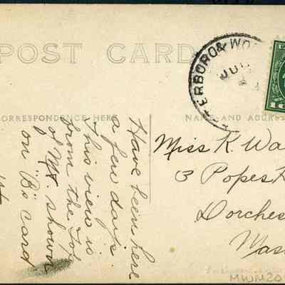Item is postcard featuring a birds-eye view of a valley below a mountain. The caption reads, 'Jaffrey, N. H. from the top of Mt. Monadnock.' The back side is divided for separate spaces for the note and the address. It features a note, address, postage stamp and postmark.