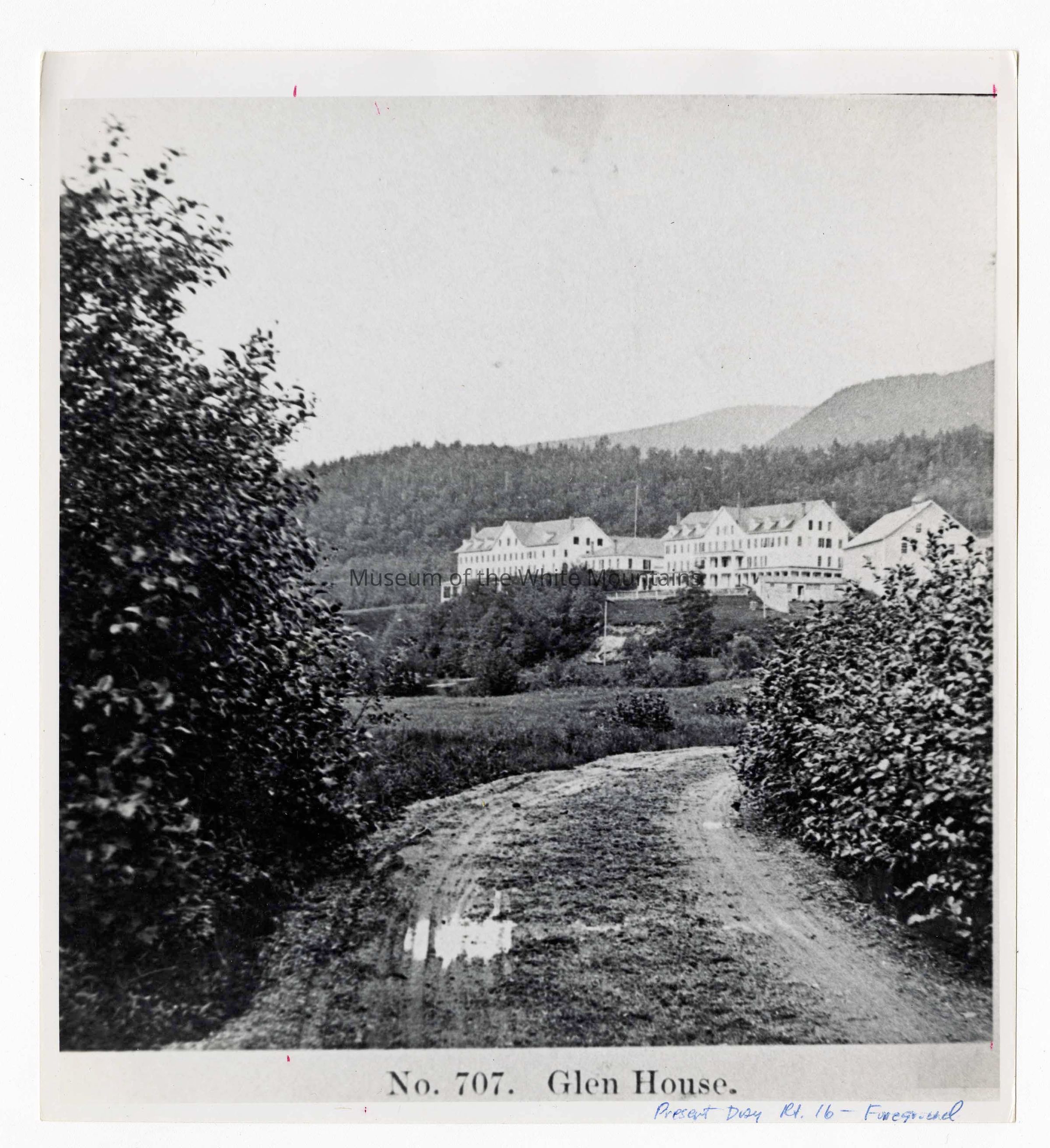 View of front of Glen House from road up to house. About 45 degree off from stright image of front of house. Plants/trees along path covering partial image. Similar to 0026 but larger print.