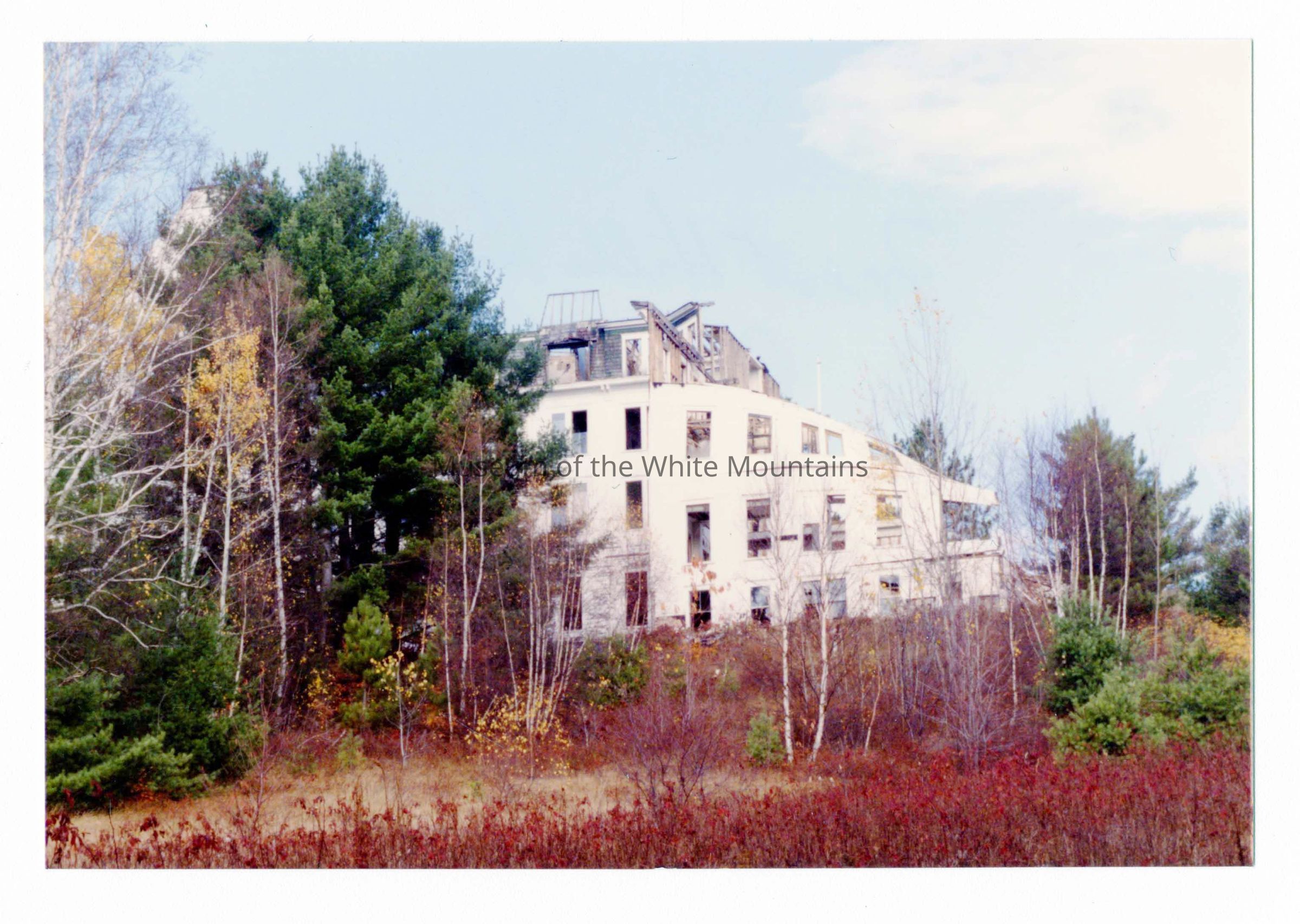 Color photo of The Forest Hills Hotel in October 1984. The building had been abandoned by 1978, when the contents were auctioned off, salvagers removed usable materials, and one wing was removed by a demolition crew. The hazardous collapsing remains were burned as a practice in fire control by the Franconia Fire Department in early January of 1986.Acquisition