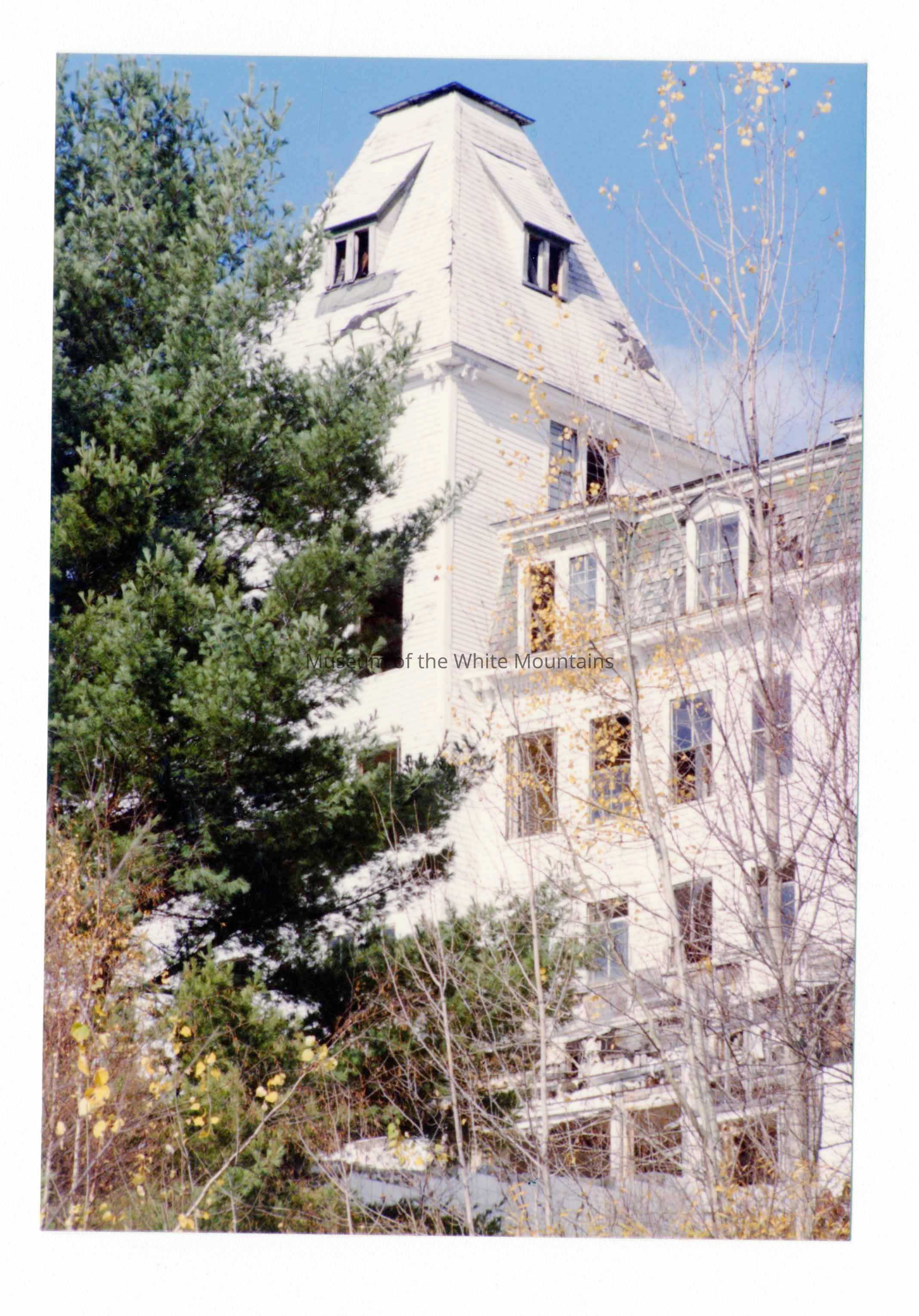 Color photo of The Forest Hills Hotel in October 1984. The building had been abandoned by 1978, when the contents were auctioned off, salvagers removed usable materials, and one wing was removed by a demolition crew. The hazardous collapsing remains were burned as a practice in fire control by the Franconia Fire Department in early January of 1986.Acquisition