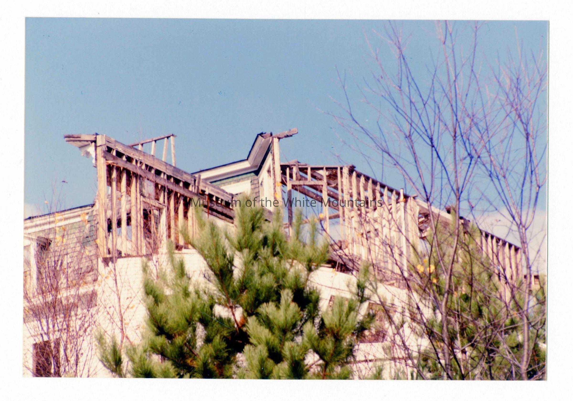 Color photo of The Forest Hills Hotel in October 1984. The building had been abandoned by 1978, when the contents were auctioned off, salvagers removed usable materials, and one wing was removed by a demolition crew. The hazardous collapsing remains were burned as a practice in fire control by the Franconia Fire Department in early January of 1986.Acquisition
